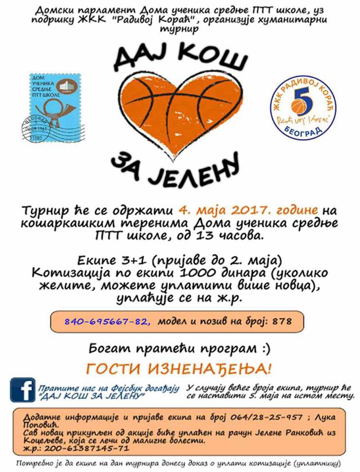 Domski parlament Doma učenika srednje PTT skole organizuje humanitarni turnir u basketu pod nazivom „Daj koš za Jelenu”, u četvrtak 4. maja na košarkaskim terenima Doma, sa početkom od 13 časova.