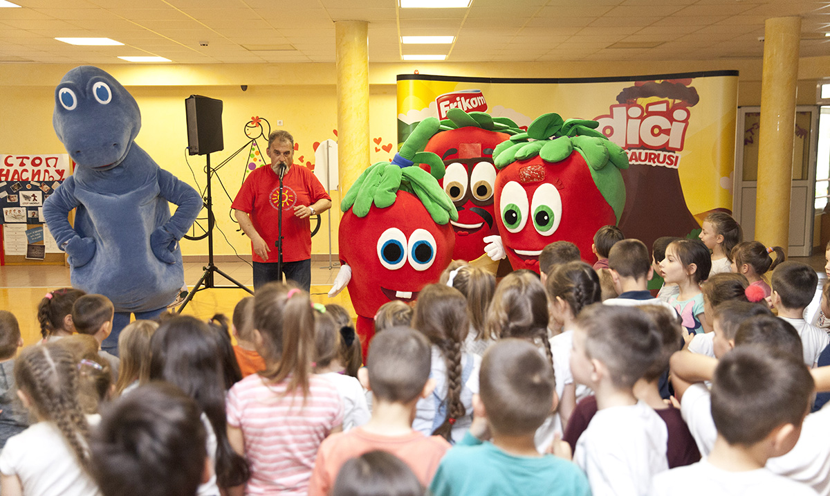 Predstava ,,Jagodići i dinosaurusi’’ u ustanovama socijalne zaštite deo je društveno odgovornog pristupa kompanije Frikom da ovoj deci ulepša trenutke provedene u ustanovama, i pruži priliku da uz omiljenu poslasticu nauče i nešto novo.