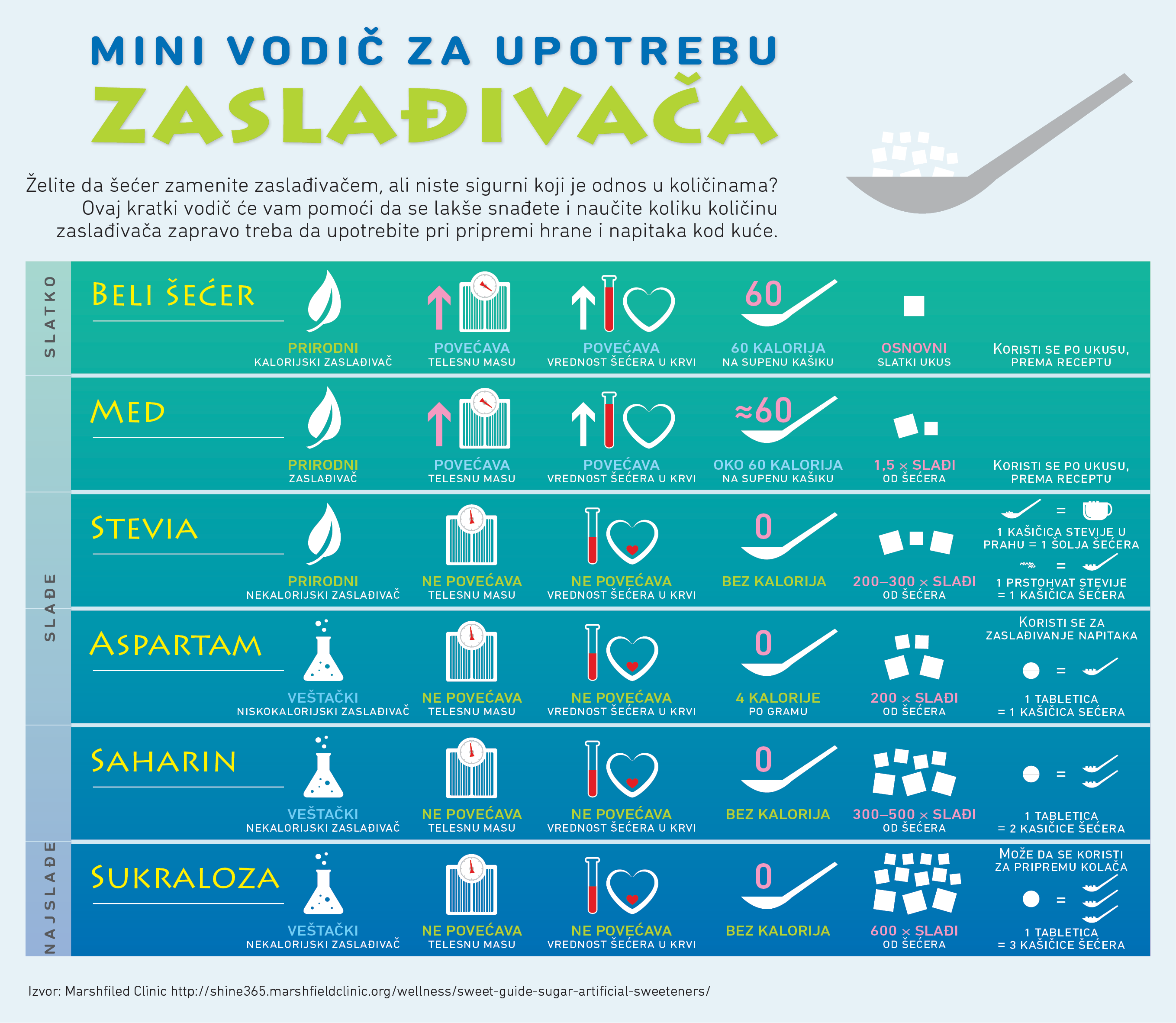 Niskokalorijski i nekalorijski zaslađivči su od višestruke pomoći u kontroli telesne mase. Zamena šećera niskokalorijskim i nekalorijskim zaslađivačima smanjuje energetsku gustinu ishrane odnosno smanjuje se unos energije. Uz to zaslađivači ne utiču na apetit što je od posebnog značaja za sve koji žele da kontrolišu svoju telesnu težinu, a da pri tom ne izgube na kvalitetu života. Međutim, glavna je nedoumica kako u svakodnevnoj ishrani zameniti obični šećer zaslađivačima. Pogledajte ovaj mini vodič koji vam može pomoći u tome.