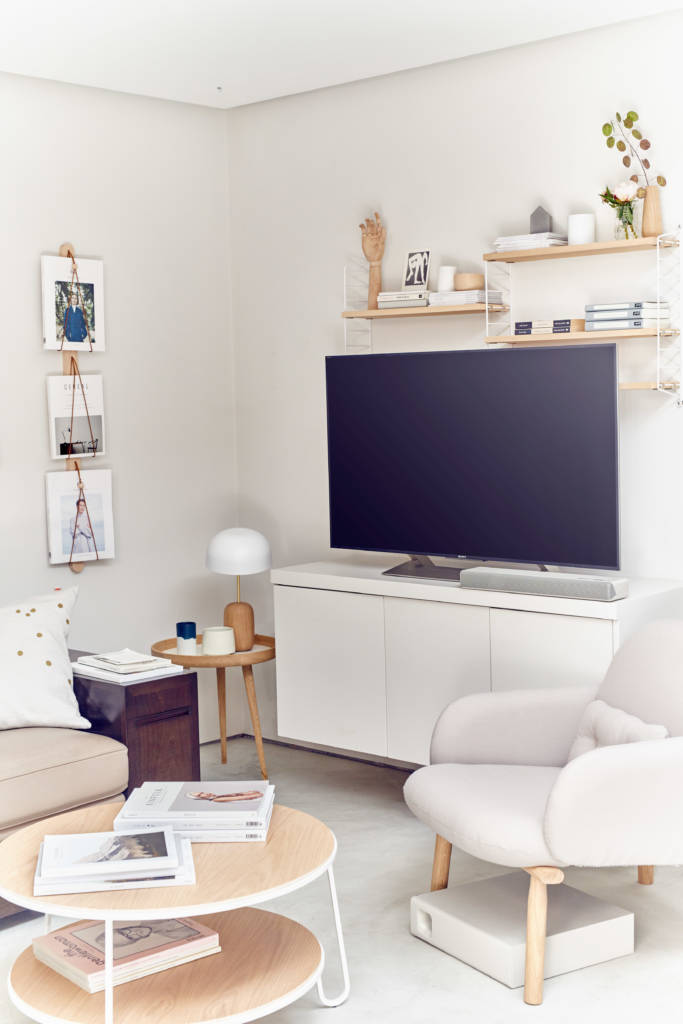 - Izaberite uređaje koji će se uklopiti u izgled i atmosferu stana, bez dominacije prostorom. Primera radi, Sony kompaktni soundbar sistem funkcioniše kao samostalni zvučnik, ali i kao surround audio sistem* za vaš TV, čime se eliminiše potreba za više različitih zvučnika i kablova koji prave nered, dok niskotonac može da se postavi ispod sofe bez rizika od gubitka zvuka.