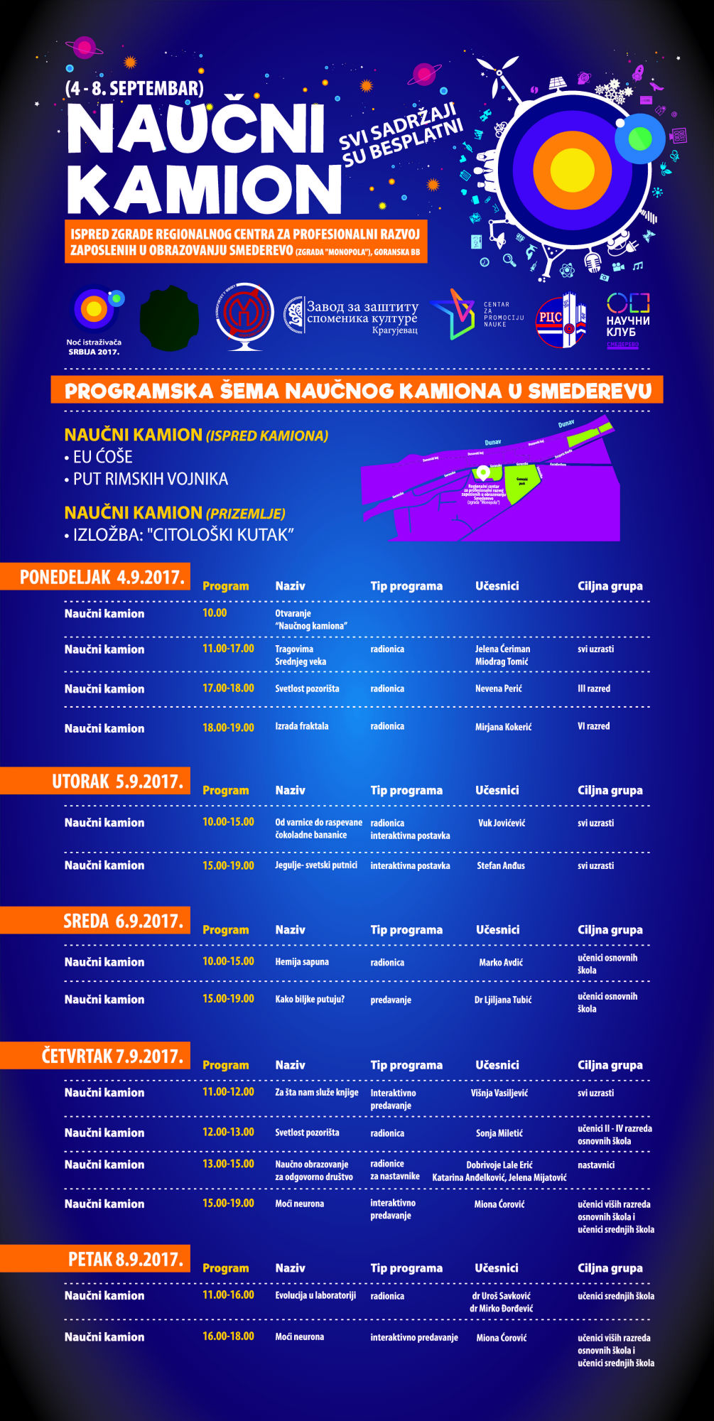Načni kamion biće postavljen ispred Regionalnog centra za profesionalni razvoj zaposlenih u obrazovanju Smederevo, zgrada „Monopola“, Goranska bb u periodu od 4. do 8. septembra 2017.