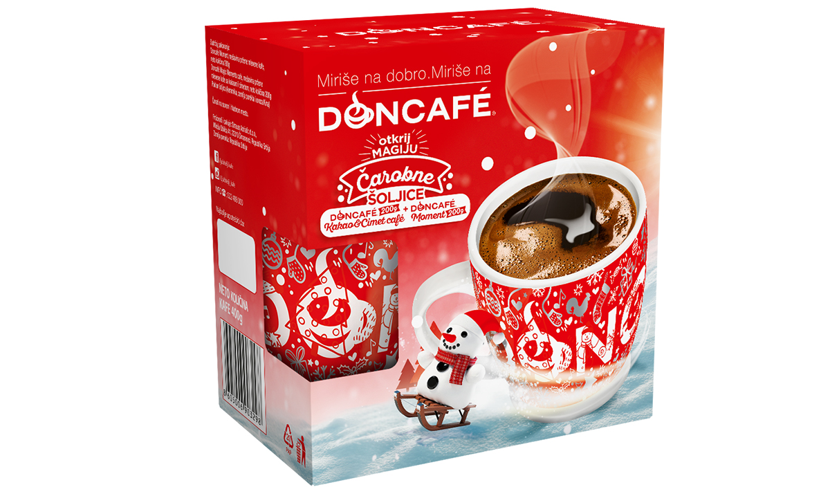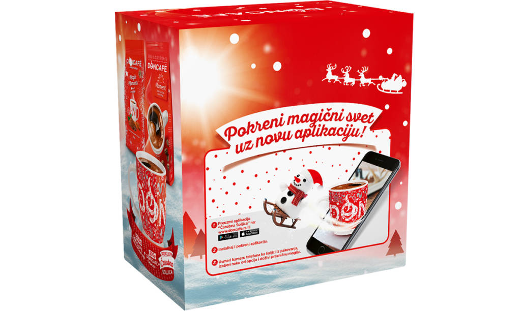U prazničnom paketu, uz Moment od 200g i Kakao & Cimet od 200g, čeka vas Doncafé čarobna šoljica koja u vaše tople domove unosi miris Doncafé jutra, uz škripu snega i prave avanture na sankama. Skinite mobilnu aplikaciju, oživite čarobnu šoljicu i podelite tu sliku sa prijateljima na Facebook-u!