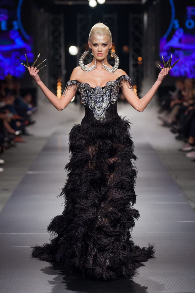 – Za mene glavna reč koja oslikava ovu kolekciju je – emocija. Predstavljen je sanjarski, melanholičan, crni ali nikad negativan svet. Moja kolekcija nalazi se između loše i dobre čarolije. Nekada se ne osećamo dobro i želimo da ostanemo u toj poziciji. Kada bi se svi oblačili jednostavno, onda bi smo svi izgledali isto i to ne bi ličilo ni na šta. Novi materijal ove sezone je perje, što je značajno jer sa perjem nisam radio godinama. Njega posle ne morate da skinete, samo će otpasti I tako će haljina dobiti drugačiji izgled, kao da ste kupili novu – kroz smeh dodaje Emerik Fransoa, član institucije Visoke mode u Parizu i potpredsednik Serbia Fashion Weeka.