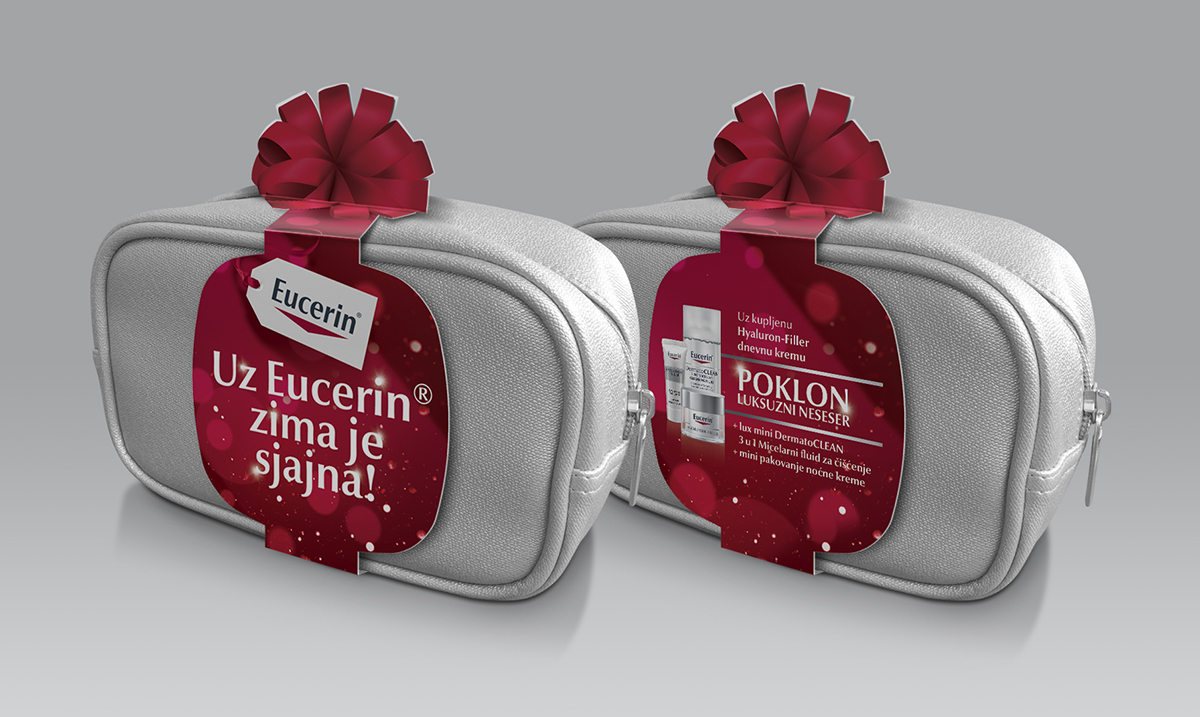 U susret novogodišnjim praznicima, uz kupovinu jednog preparata iz bilo koje Eucerin® antiage linije (osim krema za negu područje oko očiju), na poklon dobijate luksuzni neseser koji sadrži Eucerin®DermatoClean Micelarni fluid za čišćenje lica od 125ml i noćnu i dnevnu kremu u pakovanjima idealnim za putovanje.