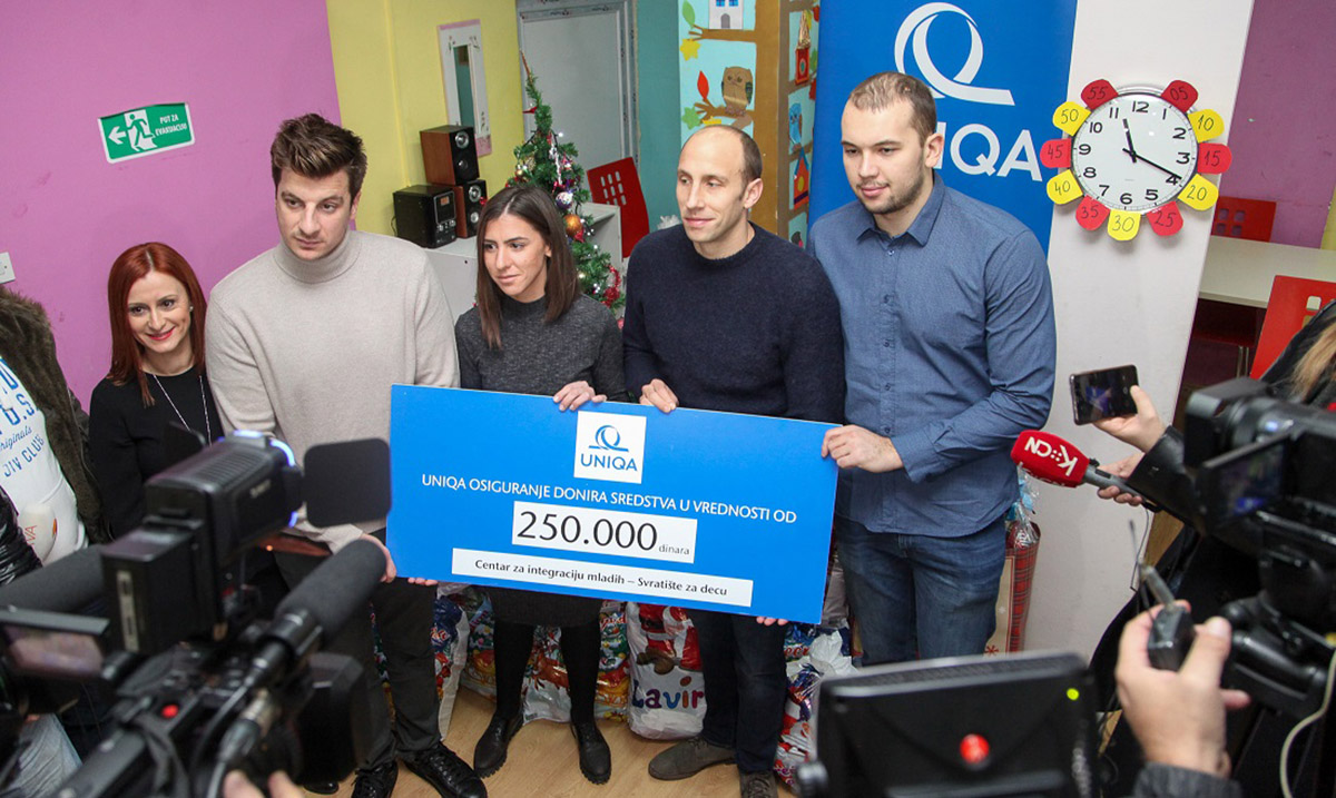 Naši vaterpolo reprezentativci i promoteri UNIQA osiguranja Andrija Prlainović, Milan Aleksić i Dušan Mandić danas su ispred ove kompanije uručili ček u iznosu od 250.000 dinara Svratištu za decu. Donacija će biti preusmerena za razvoj programa obrazovanja, kojim ova institucija uz pružanje utočišta, obroka, odeće, zdravstvene nege i brojnih drugih vidova podrške nastoji da unapredi kvalitet života dece koja žive ili rade na ulici.