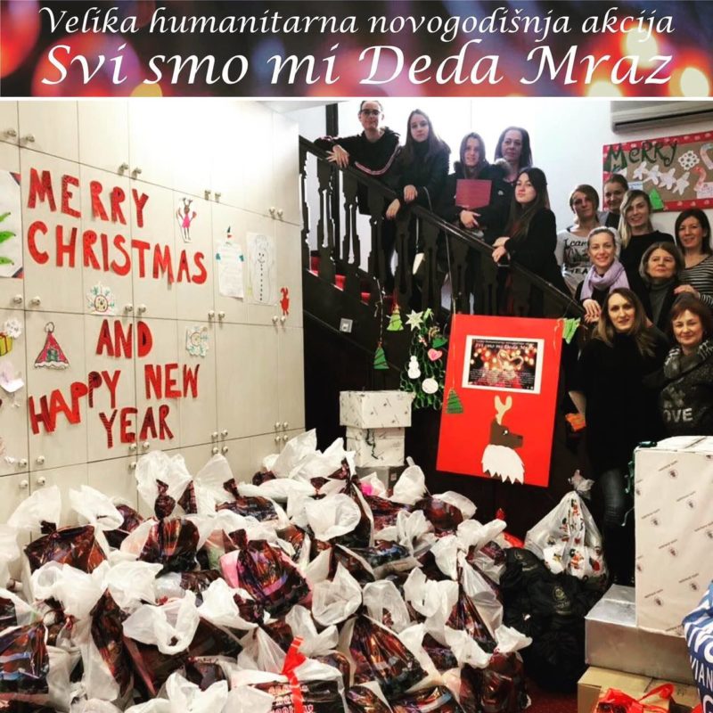 Humanitarna akcija „Svi smo mi Deda Mraz“ pokrenuta je sa željom da se najmlađima iz ugroženih društvenih grupa, ali i starim, zaboravljenim licima pošalje poruka da su nam važni i da mislimo na njih. Deca, roditelji i zaposleni u VOS Kreativno pero sa puno posvećenosti i ljubavi, za mališane i njihove porodice spakovali su više od 250 novogodišnjih paketića i više od 1500 kilograma osnovnih životnih namirnica, kućne hemije, knjiga, školskog pribora, igračaka, obuće i odeće, a svaki paket je upotpunjen unikatnim poklončićem i čestitkom, koje su deca sa svojim roditeljima, vaspitačima i nastavnicima sama pripremila.