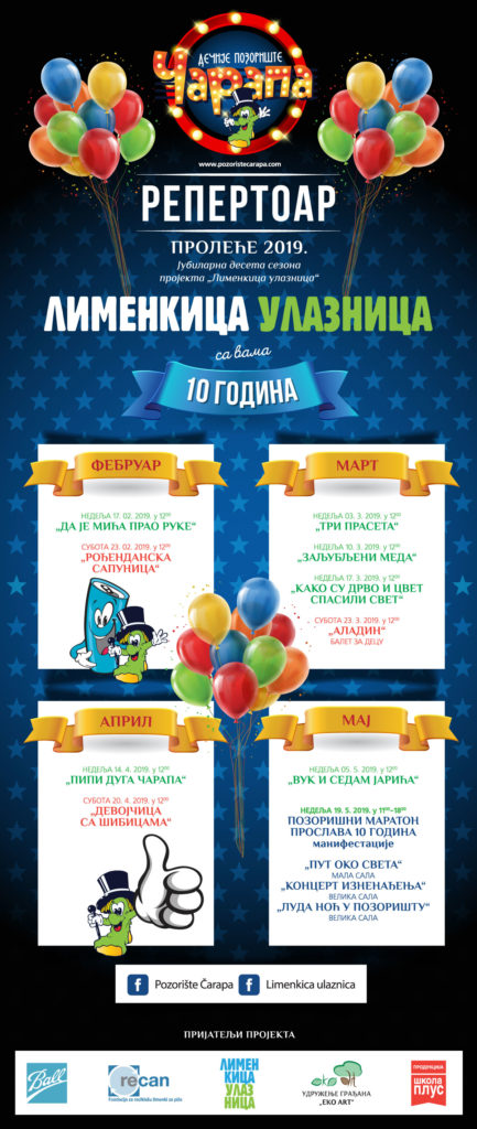 Pozorišno edukativni projekat Limenkica-ulaznica započeo je obeležavanje desete, jubilarne sezone. Ove subote, 23.02. u 12 časova, u Dečjem kulturnom centru, za predstavu „Rođendanska sapunica” mališani će tradicionalno ulazak „plaćati” praznim limenkama, koje se prikupljaju i šalju na reciklažu. Na ovaj način je tokom prethodne decenije o reciklaži učilo više od 70.000 dece i mladih u 56 gradova i mesta u Srbiji. Istovremeno je prikupljeno čak pola miliona limenki, koje je moguće reciklirati bezbroj puta, a nakon toga se kao nova pakovanja za samo 60 dana ponovo mogu naći u prodavnicama.