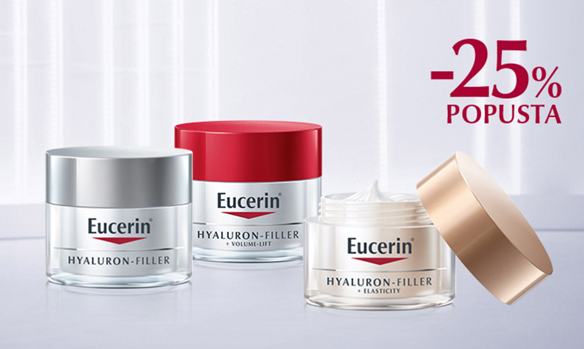 • Kreme iz Eucerin®Hyaluron-Filler linije optimalno hidriraju kožu, deluju na prve znakove starenja, popunjavaju fine linije i duboke bore. Dodatno sadrže bioaktivni saponin koji stimuliše stvaranje hijaluronske kiseline u koži. Noćna krema iz ove linije obogaćena je dekspantenolom, koji podržava proces regeneracije kože tokom noći. Novitet u ovoj liniji je Eucerin® Hyaluron-Filler Dnevna krema SPF 30, pogodna za sve tipove kože, koja koži pruža visoku zaštitu od neželjenih efekata sunca i prevremenog starenja izazvanog sunčevim zračenjem. Redovnom upotrebom krema iz Eucerin®Hyaluron-Filler linije koža je podmlađena, optimalno hidrirana, sveža i blistava!