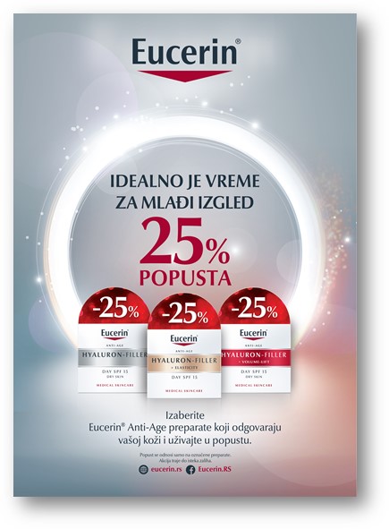 U toku marta u bolje snabdevenim apotekama potražite svoje omiljene kreme iz Eucerin® antiage linija po specijalnoj 25 odsto nižoj ceni. Ponuda traje dok traju zalihe. Popust ne važi za promotivna pakovanja i preparate sa već sniženom cenom.