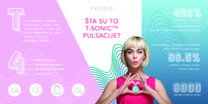 Give me a T! Dakle, slovo T označava reč transdermalno, s obzirom na to da pulsacije prodiru duboko u slojeve kože, stimulišući cirkulaciju krvi i uklanjanje nečistoća u porama. Rezultati pokazuju da ova pulsiranja ukombinovana sa ultrahigijenskim silikonom FOREO uređaja, uklanjaju 99,5 odsto nečistoća, masnoća, ostatka šminke i mrtvih ćelija, mitisere, i naposletku vraćaju koži prirodan sjaj. Ukratko – ova tehnologija je odgovor na sve nedostatke ručnog čišćenja lica. Niko više ne mora da čisti lice prstima!