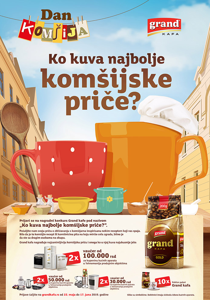 Pozivamo vas da do 17. juna 2019. godine na sajtu https://www.grandkafa.rs/ prijavite svoju komšijsku priču, inspirisanu jelom koje spaja vas i vašeg omiljenog komšiju i osvojite vredne nagrade!