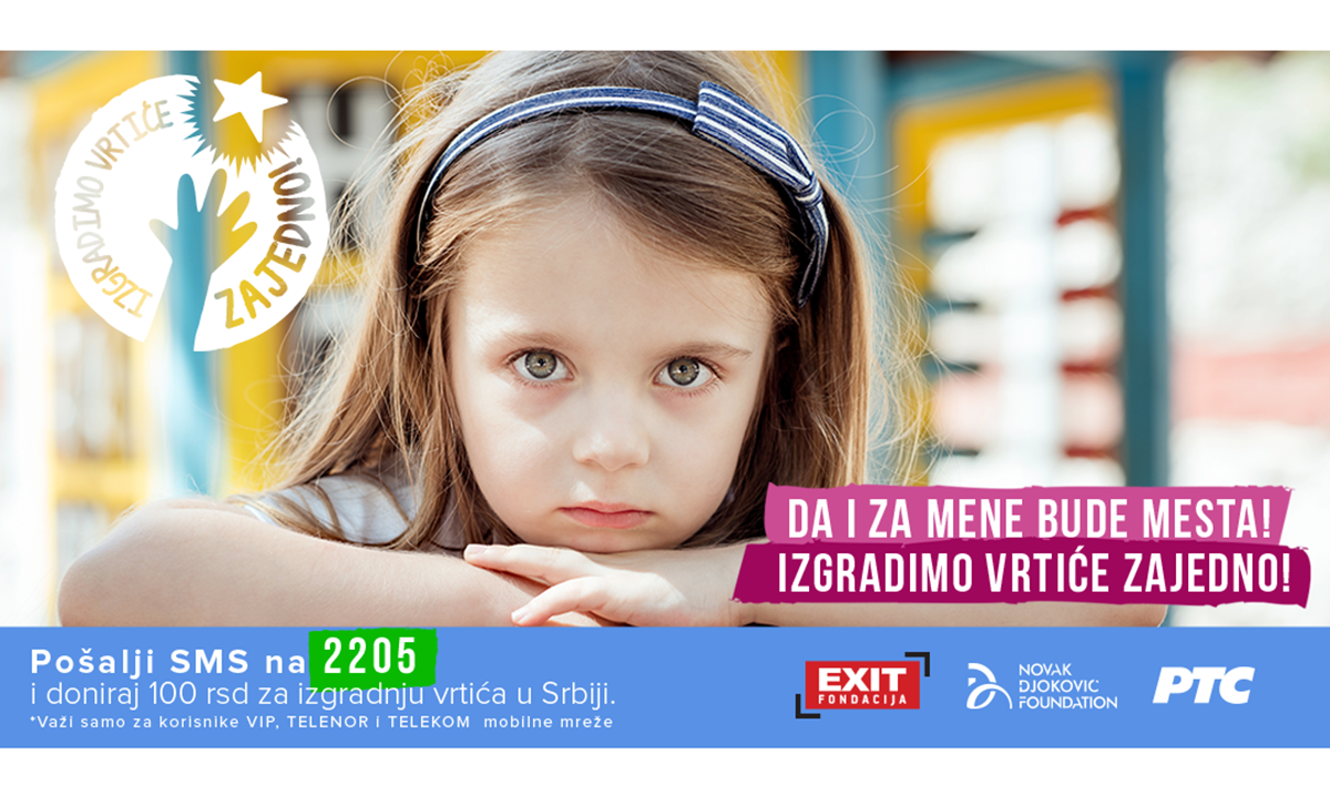 Početak ovogodišnjeg EXIT festivala označiće i početak nove nacionalne humanitarne kampanje „Da i za mene bude mesta – izgradimo vrtiće zajedno“ koju organizuju Fondacija Novak Đoković i Exit Fondacija, uz podršku RTS-a. Za ovu namenu za sve korisnike domaćih mobilnih operatera otvoren je poseban humanitarni broj 2205, koji simbolično predstavlja datum Novakovog rođendana, a cena poruke iznosi 100 dinara. Tim povodom, najbolji teniser sveta Novak Đoković obratio se video porukom i pozvao sve da podrže akciju prikupljanja pomoći za predškolske ustanove na teritoriji cele zemlje.