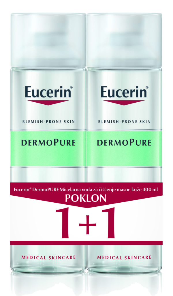 1+1 Eucerin® DERMOPURE Micelarna voda (400ml) zamenjuje upotrebu gela za čišćenje lica i tonika. Nežno i bez iritacija uklanja nečistoće, šminku i višak sebuma pružajući koži neophodnu hidrataciju. Nakon upotrebe koža je hidrirana i meka.