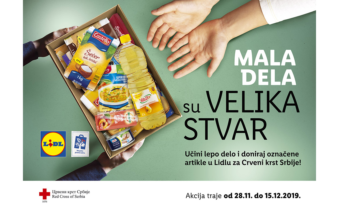 U susret predstojećim praznicima, Lidl Srbija pokreće veliku kampanju prikupljanja namirnica za korisnike humanitarnih programa Crvenog krsta Srbije, pod nazivom „Mala dela su velika stvar“, u kojoj se potrošači pozivaju da kupe i doniraju proizvode. Ova akcija će trajati od 28. novembra do 15. decembra u svim Lidl prodavnicama, a u znak zahvalnosti doprinosu potrošača, kompanija će obezbediti dodatna novčana sredstva, namenjena opremanju više od 10 narodnih kuhinja širom Srbije.