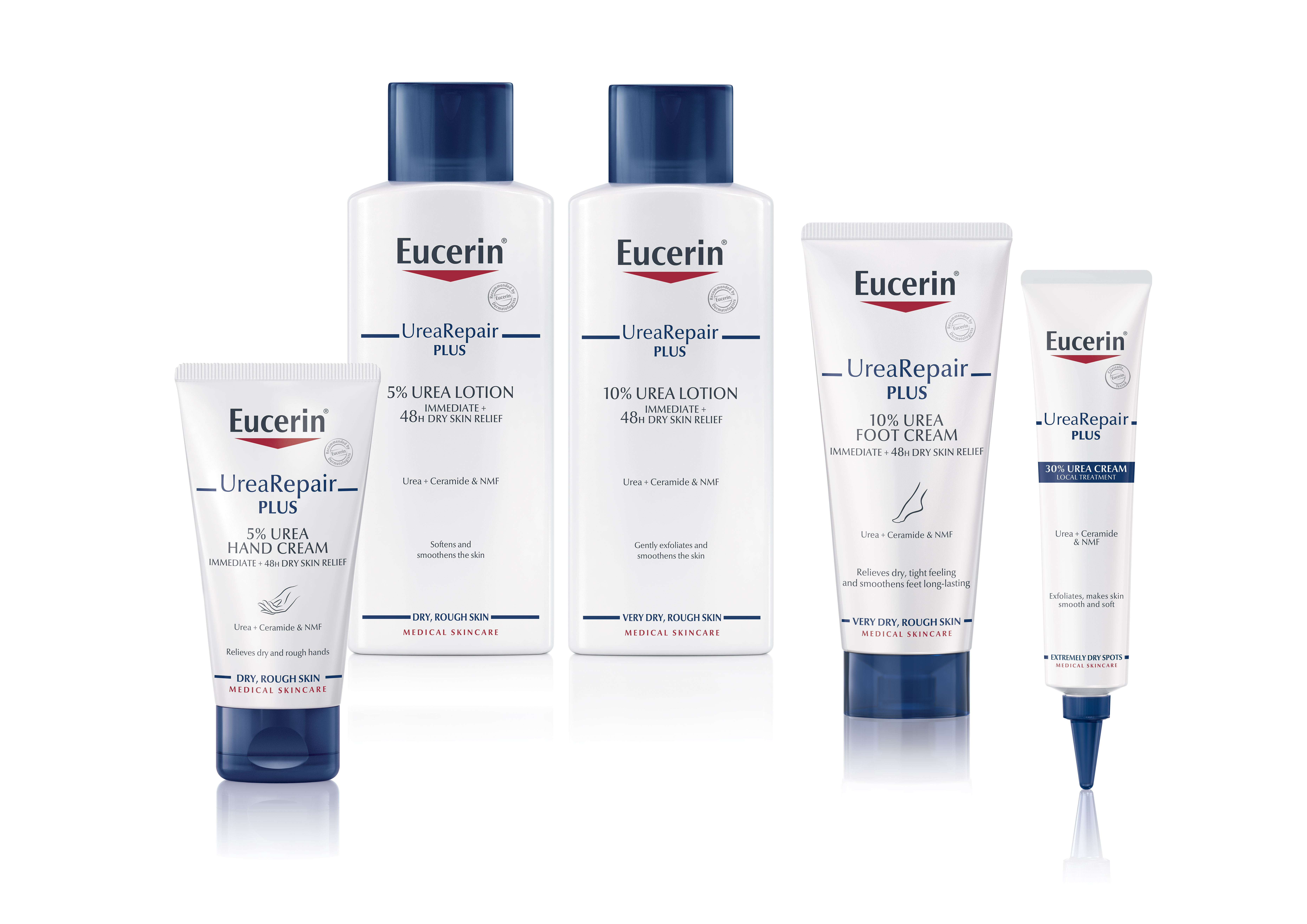 Eucerin®UreaRepair Plus linija za negu suve i izrazito suve kože sadrži jedinstvenu, visoko efikasnu kombinaciju koži neophodnih prirodnih vlažećih sastojaka. Klinički dokazano preparati iz Eucerin®UreaRepair Plus linije trenutno ublažavaju i 48 sati odlažu pojavu simptoma suve kože i intezivno je hidriraju. Preparati iz ove linije sadrže ceramide i ostale prirodne vlažeće faktore (PVF) koji vezuju vodu, jačaju prirodnu zaštitnu funkciju površinskih slojeva kože i sprečavaju gubitak vlažnosti. Koža ih brzo upija bez ostavljanja masnih tragova. Uz redovnu negu, koža je meka, nežna na dodir i elastična.