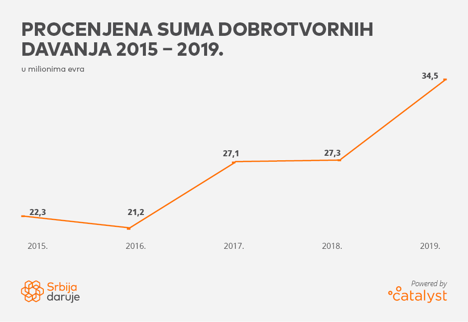 Prema istraživanju fondacije Catalyst Balkans Srbija daruje 2019, građani i kompanije u Srbiji donirali su 34,5 miliona evra za opšte dobro u 2019. godini što pokazuje rast dobrotvornih davanja od 26,2 odsto u odnosu na prethodnu godinu, dok je aktuelna borba protiv korona virusa ujedinila građane i kompanije koji su od početka krize do sredine aprila donirali skoro 9 miliona evra.