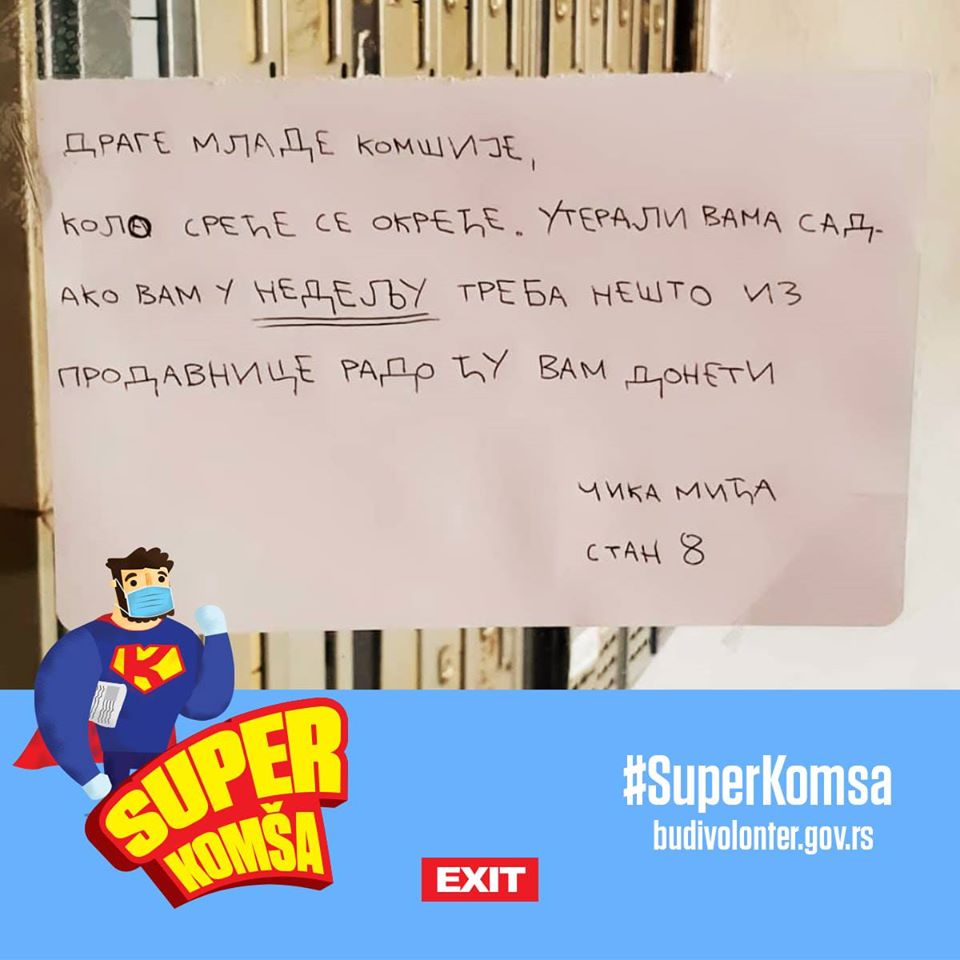EXIT je od proglašenja pandemije novog korona virusa zaustavio sve aktivnosti na promociji festivala i usmerio sve svoje snage na pomoć društvu tokom vanrednog stanja. Jedna od tih akcija je i „Super Komša“, pokrenuta je sa ciljem da se poveća broj volontera koji bi pomoć pružali najugroženijim delovima stanovništva. Tako su se hiljade mladih ljudi tokom vanrednog stanja prijavili na Volonterski centar Srbije na adresi budivolonter.gov.rs i uz sve mere opreza, pomagali pre svega starijim, ali i drugim građanima koji nisu bili u mogućnosti da idu napolje po osnovne namirnice i lekove, ali ni da izbace smeće ili prošetaju svoje kućne ljubimce. EXIT je u okviru akcije „Super Komša“, pozvao i sve superheroje iz komšiluka da putem društvenih mreža podele sa drugima i svoje priče sa terena. Neke od njih su izmamile osmeh na lice, a neke su nas podsetile na ranjivost naših najstarijih sugrađana zbog kojih su prve komšije umesto Supermenovog plašta, navukle masku i krenule u akciju.