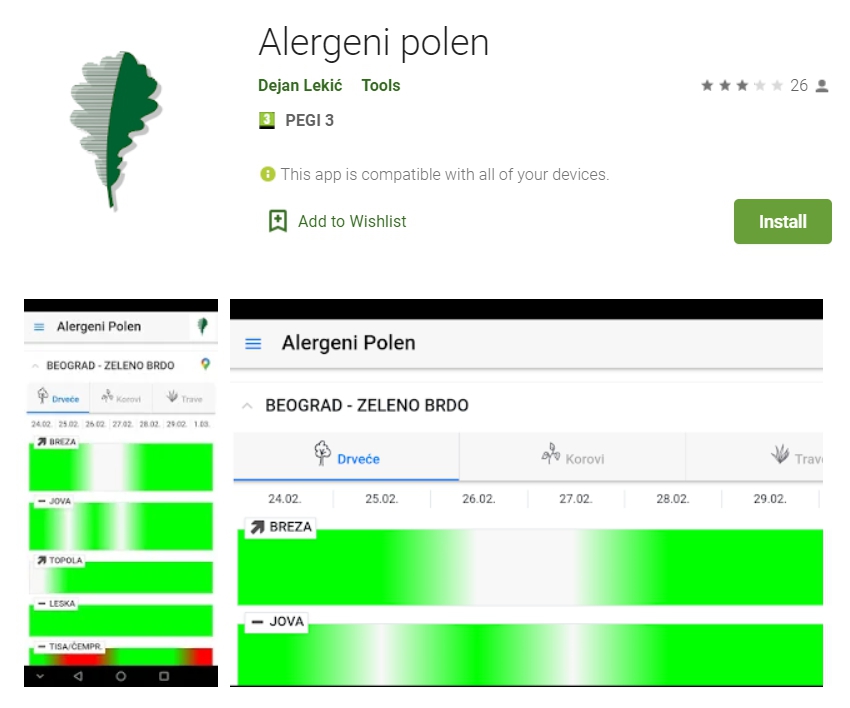 Podaci o emitovanju polena, koji se prikupljaju na 26 lokacija u Srbiji, sada su uobličeni u praktičnu i preglednu aplikaciju za mobilne telefone “Alergeni polen” koja prikazuje koncentracije polena na svakoj od lokacija i pruža predviđanje trenda za narednu nedelju. Aplikacija prati 3 grupe izvora polena – drveće, trave i korov, i daje informacije o alergenskom potencijalu i koncentraciji polena.