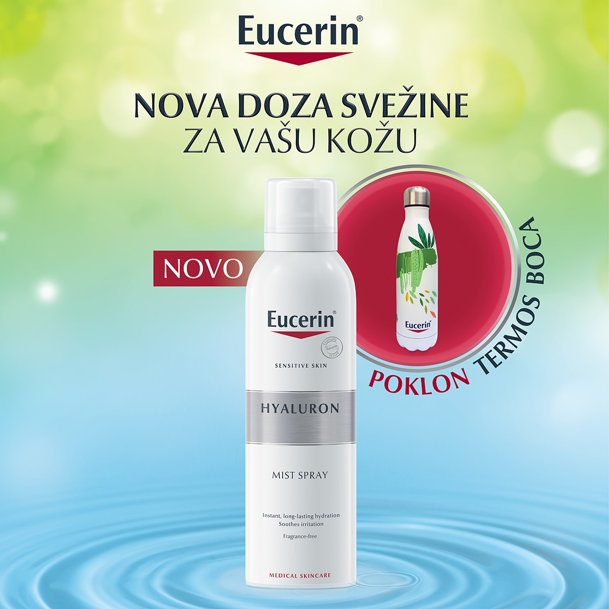 Osim vaše kože, u osvežavajućem iskustvu upotrebe ovog preparata uživaćete i vi, a obradovaće vas i poklon – atraktivna termos boca koja vas uz kupovinu ovog preparata očekuje u bolje snabdevenim apotekama!