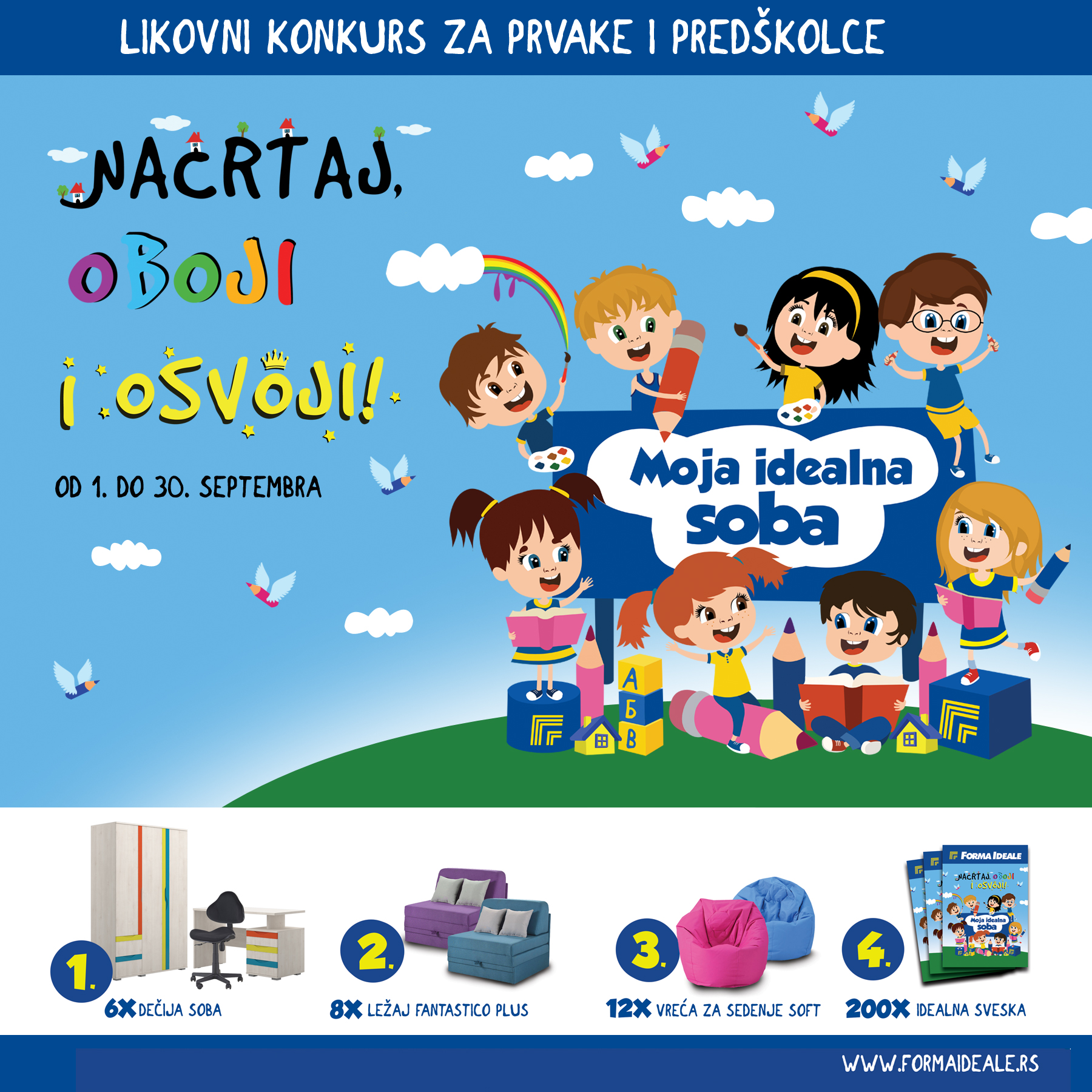 Pravi je trenutak da se kreativnost, maštovitost, originalnost i estetika dece, predškolskog i školskog uzrasta, ponovo podstaknu, a i nagrade idealnim nagradama iz Forma Ideale. U periodu od 1. do 30. septembra biće organizovan deveti po redu linkovni konkurs pod nazivom „NACRTAJ, OBOJI I OSVOJI“, sa temom „Moja idealna soba“. Zbog novonastale situacije koja je uslovila izmene u novoj školskoj godini, i uz poštovanje predloženih bezbednosnih mera, omogućeno je direktno učešće mališana na konkursu. Na sajtu www.formaideale.rs potrebno je popuniti formular traženim podacima i priložiti fotografiju crteža učesnika ili dostaviti crtež u najbiliži salon Forma Ideale.
