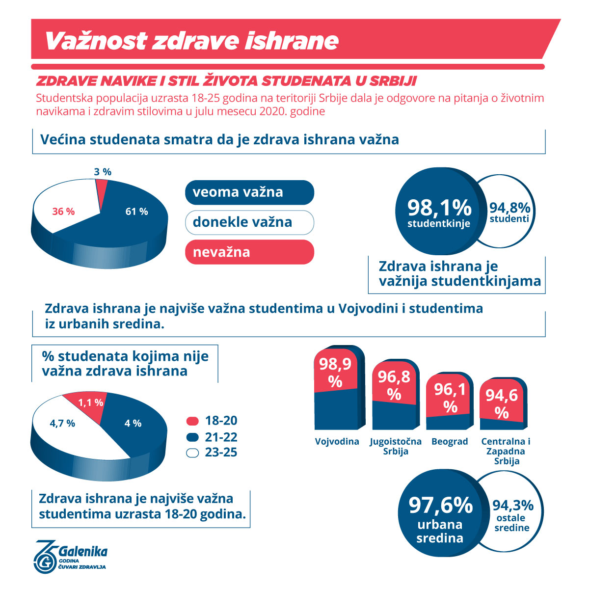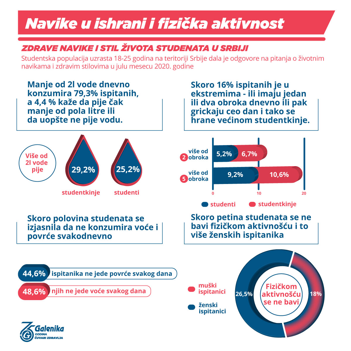 Galenika a.d. je pokrenula istraživanje o svakodnevnim navikama i zdravom stilu života studenata prema kome skoro dve trećine studenata smatra da je zdrava ishrana veoma važna. Ipak, oko 45% njih konzumira 3 obroka dnevno, dve trećine pije 1-2l vode dnevno, dok manje od trećine upražnjava sport ili fizičke aktivnosti redovno.
