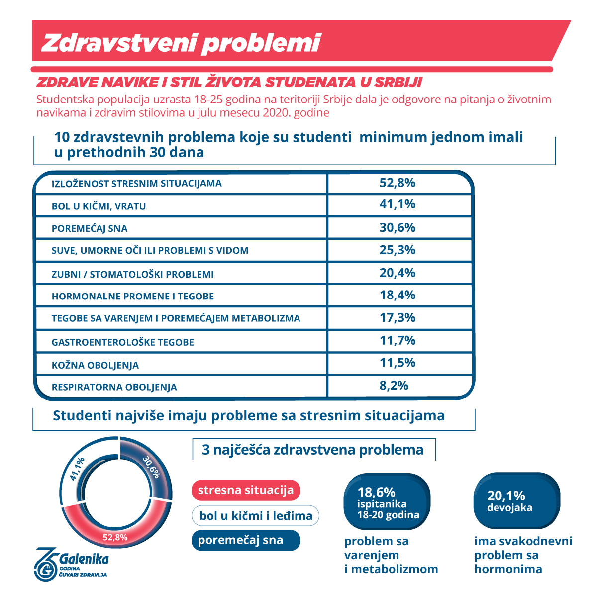 Galenika a.d. je pokrenula istraživanje o svakodnevnim navikama i zdravom stilu života studenata prema kome skoro 53% studenata u Srbiji kao najveći zdravstveni problem navodi izloženost stresnim situacijama. Ostali najčešće navođeni zdravstveni problemi su bolovi u kičmi i leđima (41%), dok poremećaj sna predstavlja najveći problem za skoro trećinu (31%) studenata.