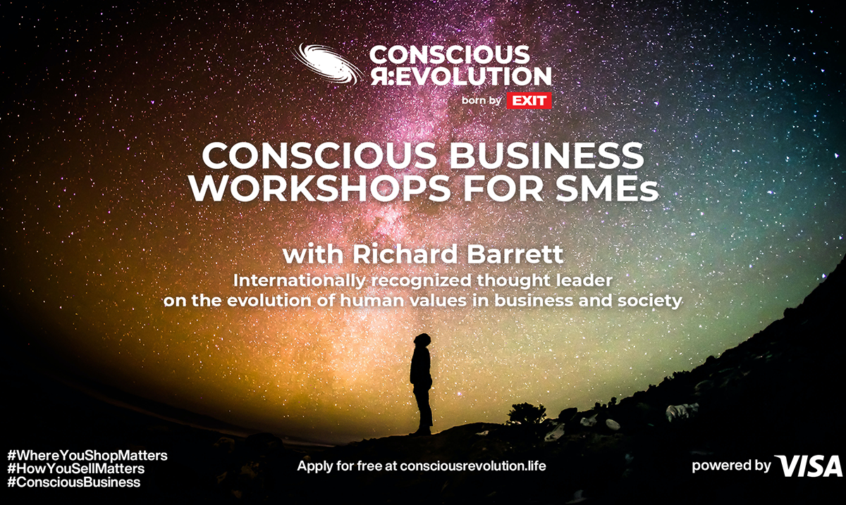 Svetski priznat autor i predavač, Ričard Baret, održaće seriju besplatnih online radionica pod nazivom „Svesno poslovanje“ tokom oktobra i novembra, a prijavljivanje za ovaj edukativni program omogućeno je svim zainteresovanim predstavnicima malih i srednjih preduzeća. Program edukacije pokrenuli su EXIT i kompanija Visa u okviru platforme „R:evolucija svesti“, kako bi u ovom izazovnom periodu pružili podršku MSP sektoru i pomogli vlasnicima biznisa da unaprede znanja u oblasti liderstva i poslovnih veština.