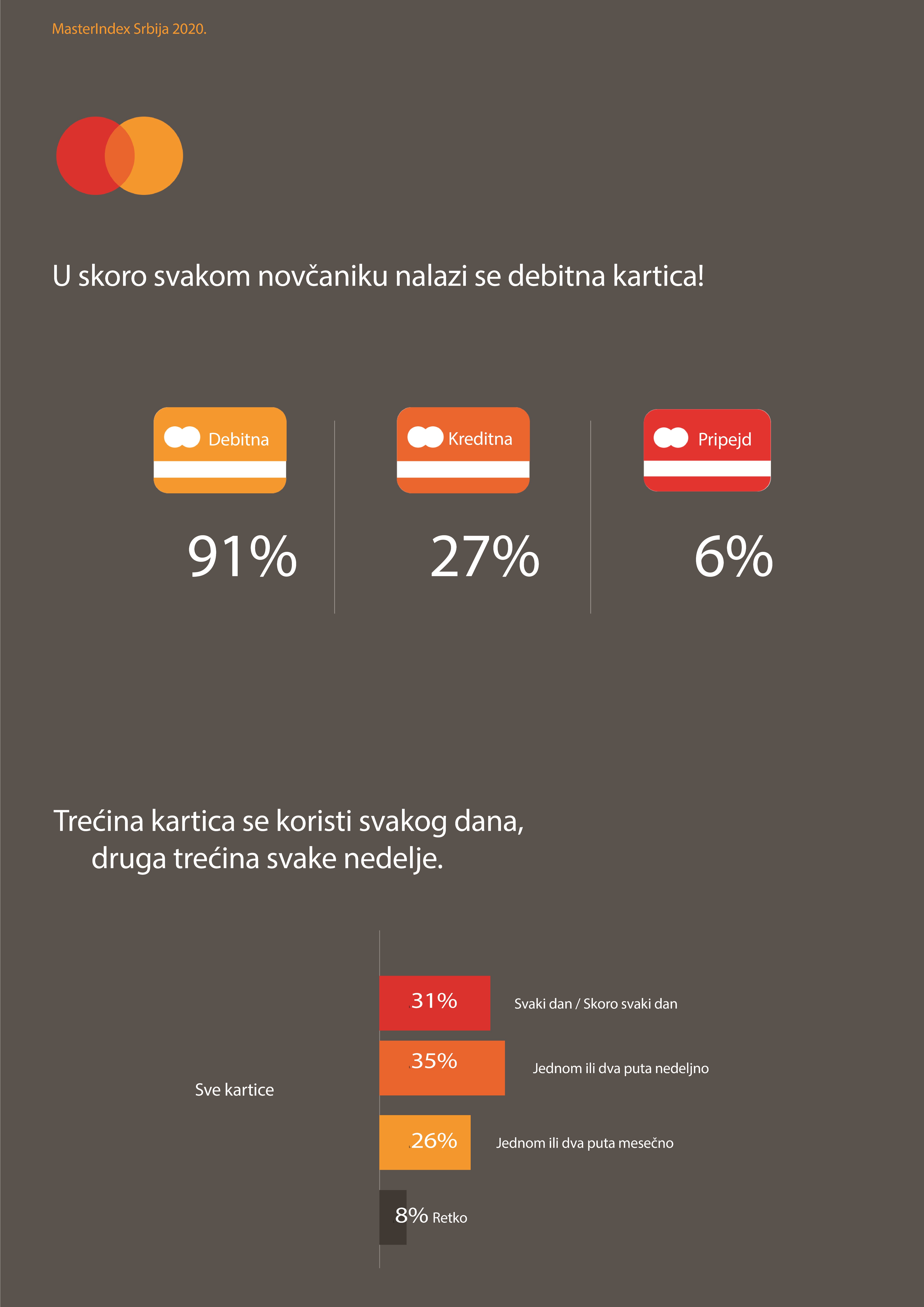 U skoro svakom novčaniku naših građana nalazi se po jedna debitna kartica, rezultati su najnovijeg MasterIndex Srbija istraživanja koje je danas objavila kompanija Mastercard. Pored 91% ispitanika koji imaju debitnu karticu, 27% ispitanika poseduje kreditnu karticu, dok 22% njih ima obe vrste platnih kartica.