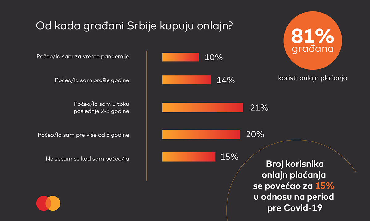 Broj korisnika onlajn plaćanja povećao se za 15% u odnosu na period pre izbijanja pandemije Covid-19, pokazalo je ovogodišnje MasterIndex Srbija istraživanje. Onlajn plaćanja koristi 81% ispitanika, od čega 10% plaća onlajn makar jednom nedeljno, dok 45% koristi onlajn plaćanja makar jednom mesečno.