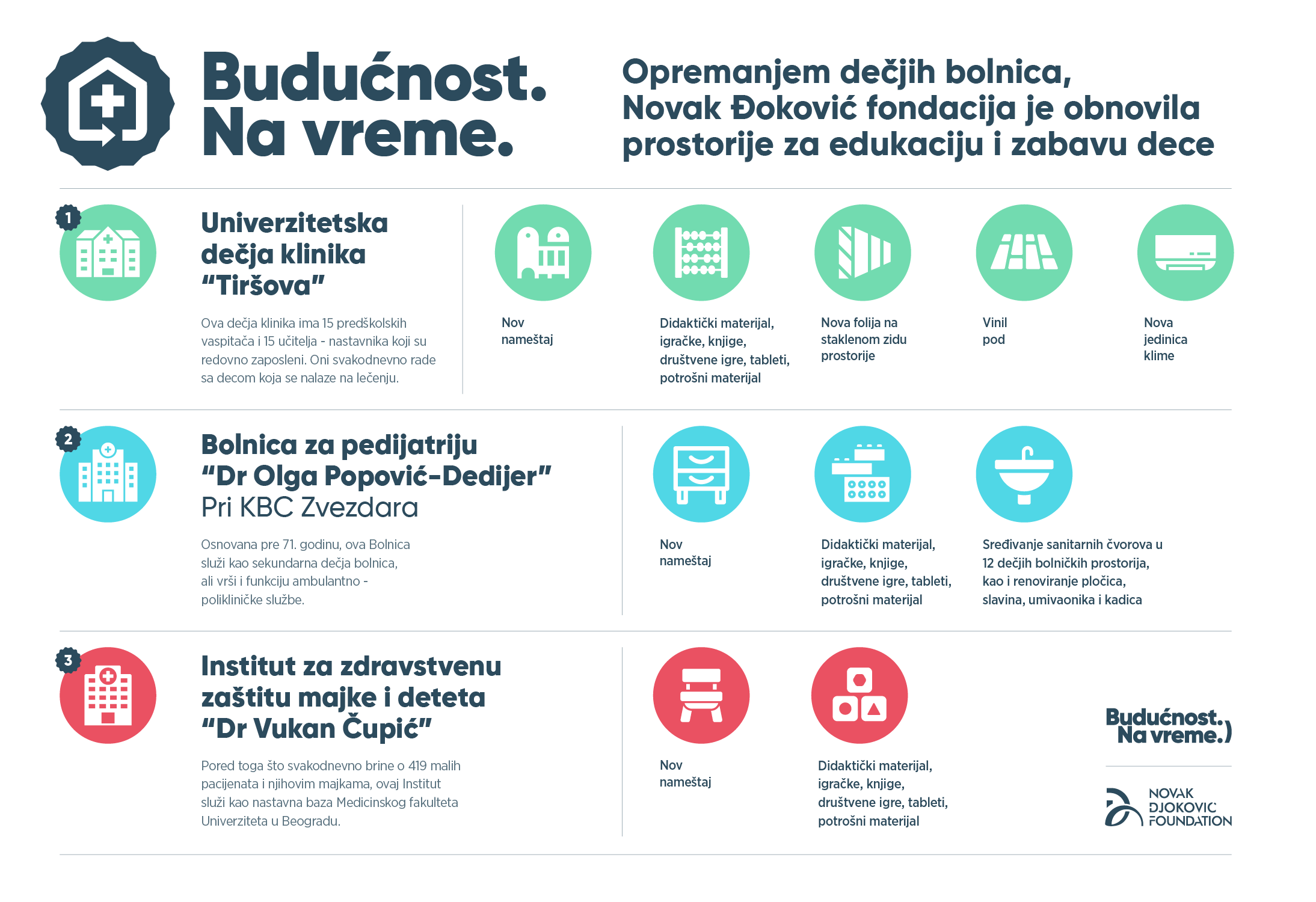 Novak Đoković fondacija i u velikom finalu ove veoma izazovne godine, s velikom odlučnošću i zadovoljstvom, nastavlja rad na podršci i ulaganju u rani razvoj i obrazovanje dece. Doživljaj usamljenosti u izazovnim okolnostima se pojačava i tada nam je svima, više nego ikada potrebna ruka povezanosti i zajedništva. Upravo ovom donacijom, u tri dečije bolnice u Begradu – u Univerzitetskoj dečjoj klinici Tiršova, Bolnici za pedijatriju „Dr Olga Popović Dedijer“, kao i u Institutu za zdravstvenu zaštitu majke i deteta „Dr Vukan Čupić“, Fondacija je želela da bolesnoj deci omogući adekvatno okruženje u vidu edukativno zabavnih prostorija u kojima će se osećati makar približno kao da su kod svoje kuće.