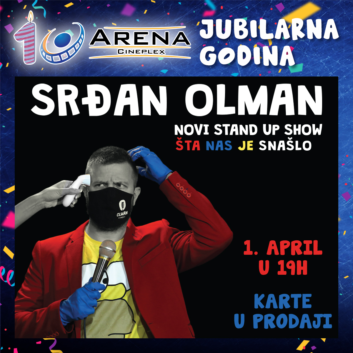 Jubilarna godina bioskopa Arena Cineplex donosi novine, ne samo filmskim sladokuscima, nego i posetiocima širih interesovanja. Tim povodom, Arena sa zadovoljstvom predstavlja stand up nastup Srđana Olmana „Šta nas je snašlo?“ koji će biti održan u četvrtak, 1. aprila u 19 časova u najvećoj sali bioskopa. Ulaznice po ceni od 800 dinara od danas su u prodaji na blagajnama Arene, a kako je kapacitet sale ograničen i rezervacija ulaznica nemoguća, obezbedite svoje mesto na vreme.