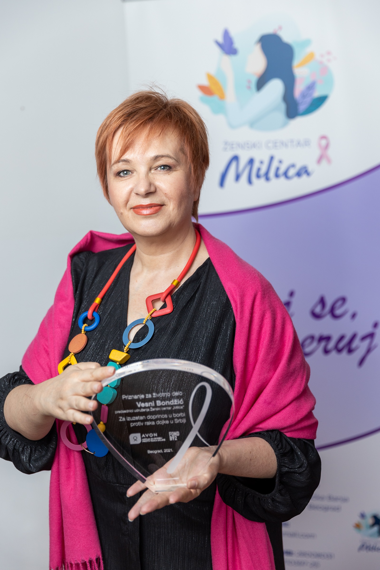 Ovom prilikom dodeljeno je i Priznanje za izuzetan doprinos u borbi protiv raka dojke koje je ove godine pripalo Vesni Bondžić, predsednici udruženja Ženski centar „Milica“: „Moja misija je počela pre 11 godina, podizanjem svesti o važnosti redovnih pregleda, a danas primam ovo priznanje predstavljajući žene nevidljive sistemu, društvu, medijima, žene koje nisu imale samo iskustvo raka dojke, već su posvetile svoj život edukaciji i podršci novoobolelima, naročito u doba pandemije.“