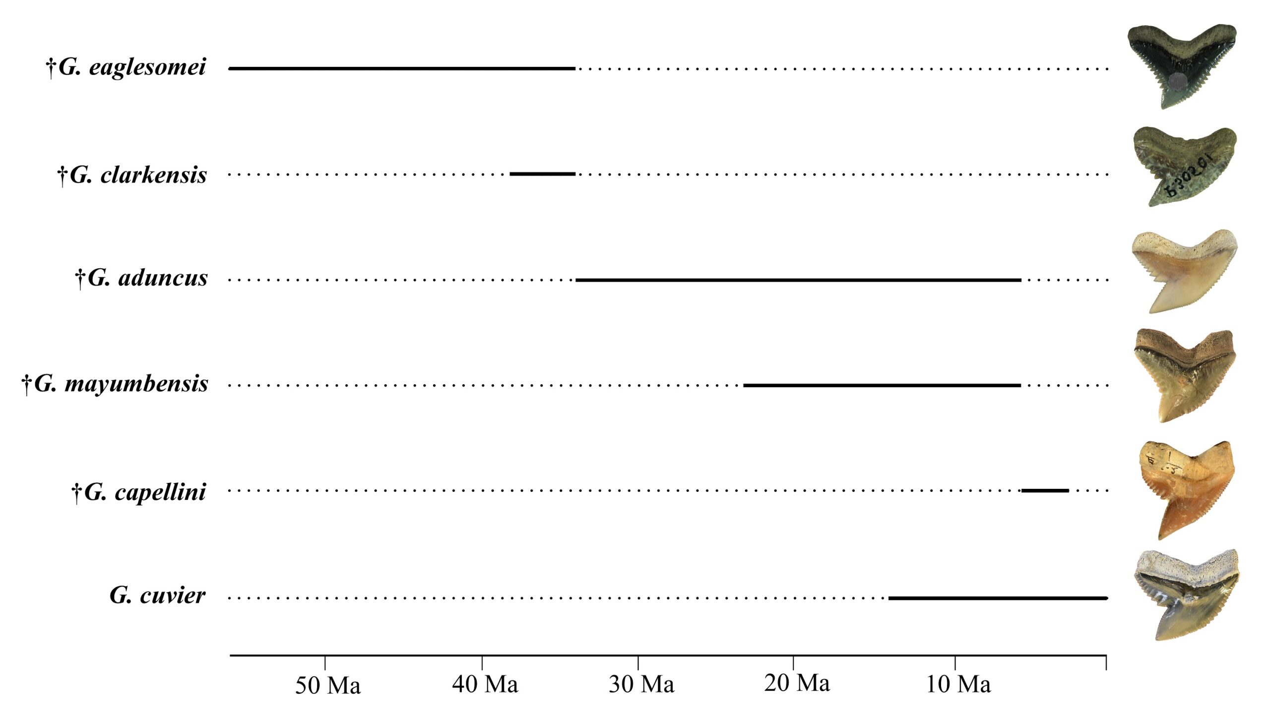 Julia Türtscher, Faviel A. López-Romero, Patrick L. Jambura, René Kindlimann, David J. Ward, Jürgen Kriwet (2021). Evolution, diversity, and disparity of the tiger shark lineage Galeocerdo in deep time. In: Paleobiology.