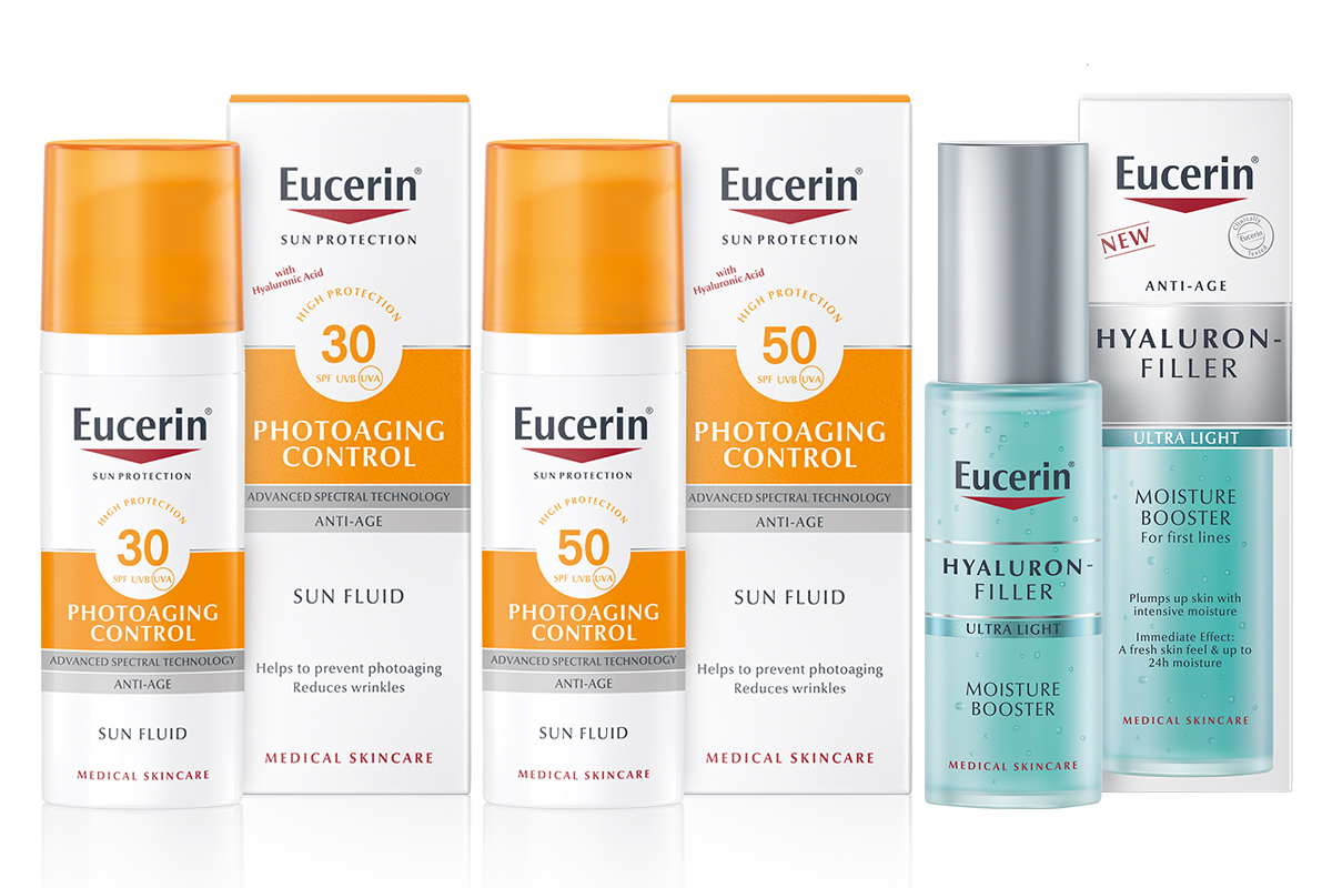 Ukoliko želite da preparat za zaštitu kože lica istovremeno umanjuje postojeće znakove starenja i hidrira kožu, pravi izbor je Eucerin®Anti-age Fluid za zaštitu od sunca SPF 30 ili 50. Za dodatnu dozu hidratacije, blistavost, jedrinu i ublažavanje sitnih bora, pre ovog preparata za zaštitu od sunca, nanesite Eucerin®Hyaluron-Filler Hidro Booster. Ovaj serum ultra-lagane formulacije udružuje dejstvo hijaluronske kiseline srednjeg i kratkog lanca i glicerina, dva najpoznatija čuvara hidriranosti kože. Zato je nekoliko kapi ovog seruma dovoljno da vašoj koži obezbedi trenutnu i intezivnu 24-časovnu hidrataciju.