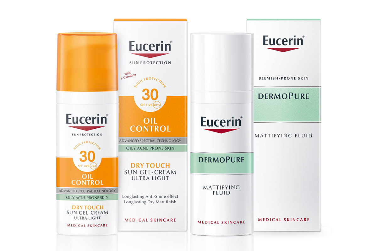 Lagana tekstura i sebum regulatorna tehnologija u formulaciji Eucerin®Oil control za zaštitu masne kože od sunca SPF 30 ili 50+ čine ovaj preparat najboljim mogućim izborom za zaštitu od sunca masne kože sklone povećanom lučenju sebuma i aknama. Nakon nanošenja vaša koža biće zaštićena od negativnih efekata sunčevog zračenja i istovremeno izgledati matirano i baršunasto, bez neželjenog sjaja. Savršena podloga ovom preparatu je Eucerin® DermoPure Matirajući Fluid koji obezbeđuje 8 sati hidratacije bez suvišnog sjaja i začepljavanja pora. Salicilna kiselina u ovom preparatu ima antibakterijska i komedolitička svojstva, pomaže da se umanje simptomi masne i problematične kože i spreči njihov ponovni nastanak. Likokalkon A ublažava iritaciju, zapaljenje kože i crvenilo, dok matirajuće čestice samanjuju vidljivost sebuma.