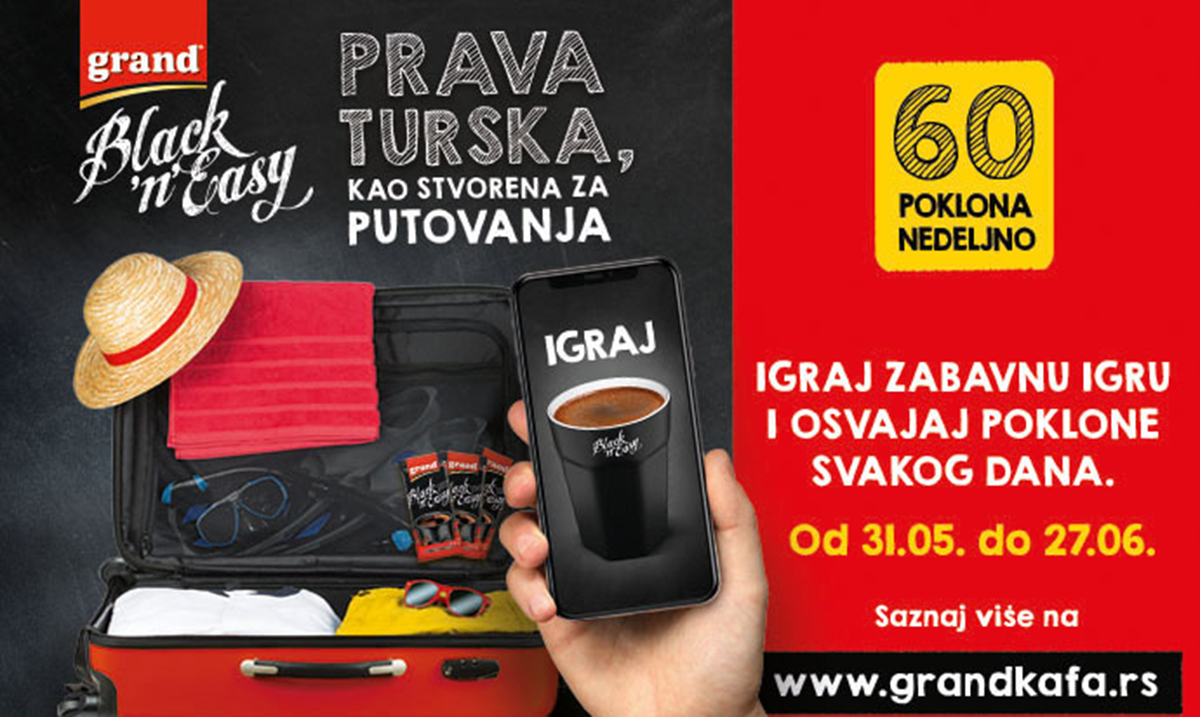Leto nam se bliži, a sa njim i putovanja koja smo željno isčekivali! Verujemo da ste već počeli da razmišljate o letnjem odmoru, a za sve vas koji ne možete da zamislite putovanje bez omiljene kafe, tu je Grand Black’n’Easy prava turska spremna za minut. Ova kafa je kao stvorena za putovanja, laka za poneti, i brzo se sprema gde god da ste. Kako bi vaš odmor bio potpun, imate priliku da do 27. juna učešćem u Grand Black’n’Easy digitalnoj igrici osvojite čak 60 poklona svake nedelje!