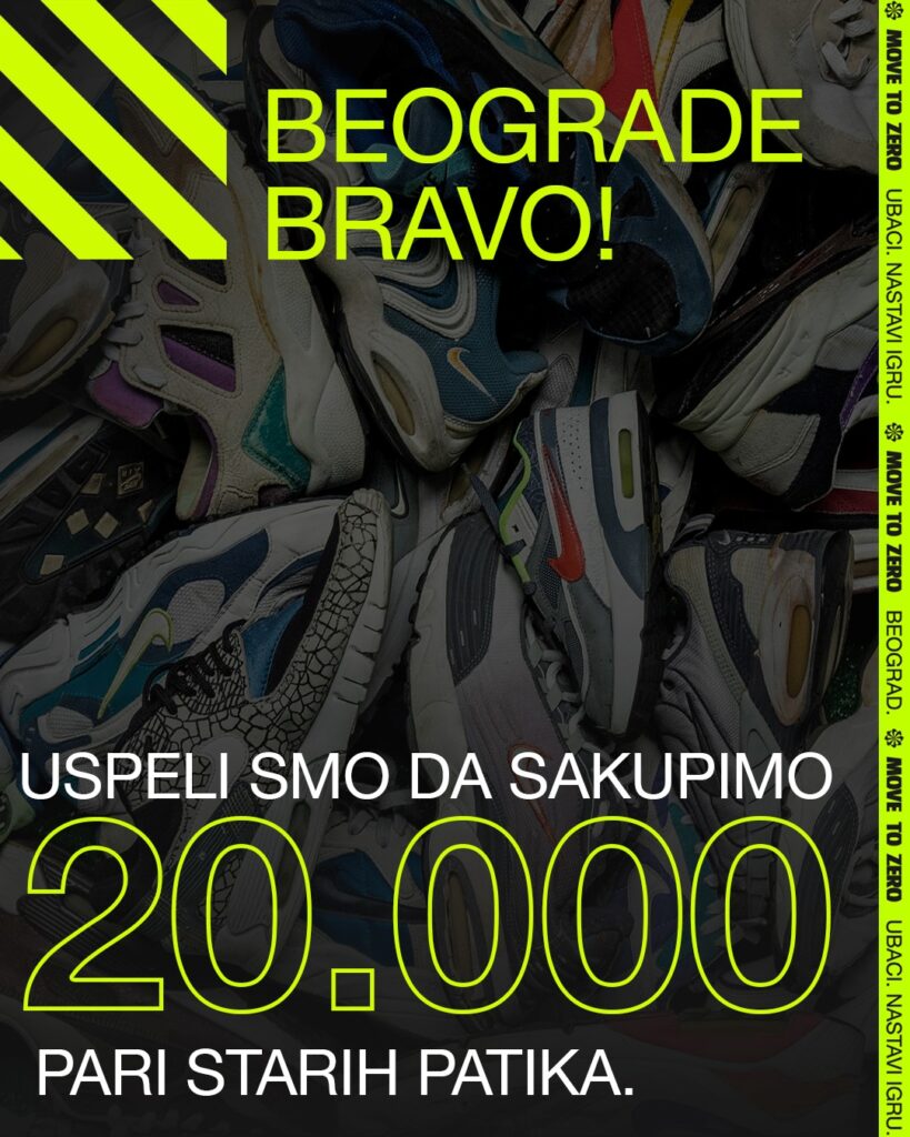 U martu ove godine, brend NIKE pokrenuo je društveno odgovornu kampanju „Move To Zero“ koja je za cilj imala prikupljanje 20.000 pari starih patika, od čijih će đonova biti napravljena nova podloga za dečije igralište i sportski teren. Više od dvadeset hiljada dobrovoljaca doniralo je svoje patike i ispunilo cilj koji je pred njihov postavio brend NIKE, a svojim starim patikama dali su novu, plemenitu svrhu.