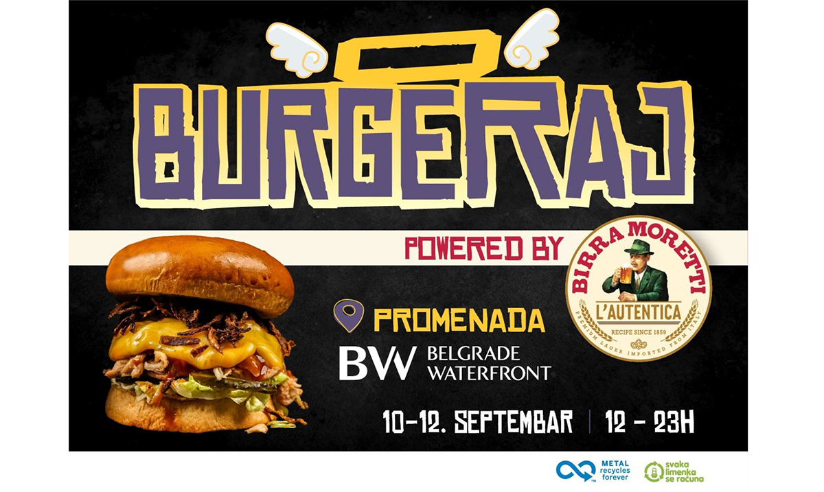 U petak, 10. septembra počinje Burgeraj – festival burgera by Birra Moretti, a svim ljubteljima beogradskog premium steet food-a biće obezbeđen besplatan ulaz u raj za sve burgere! Festivalske kapije na Belgrade Waterfront promenadi otvoriće se u petak od 12:00 h, gde će se predstaviti selekcija najboljih burgera koje će na licu mesta pripremati najbolji od najboljih, a svaki posetilac će moći da pronađe burger za sebe bilo da preferira juneći, jagnjeći, pileći, smoked, angus govedinu ili ipak veganski jer postoji idealan burger za svakoga!
