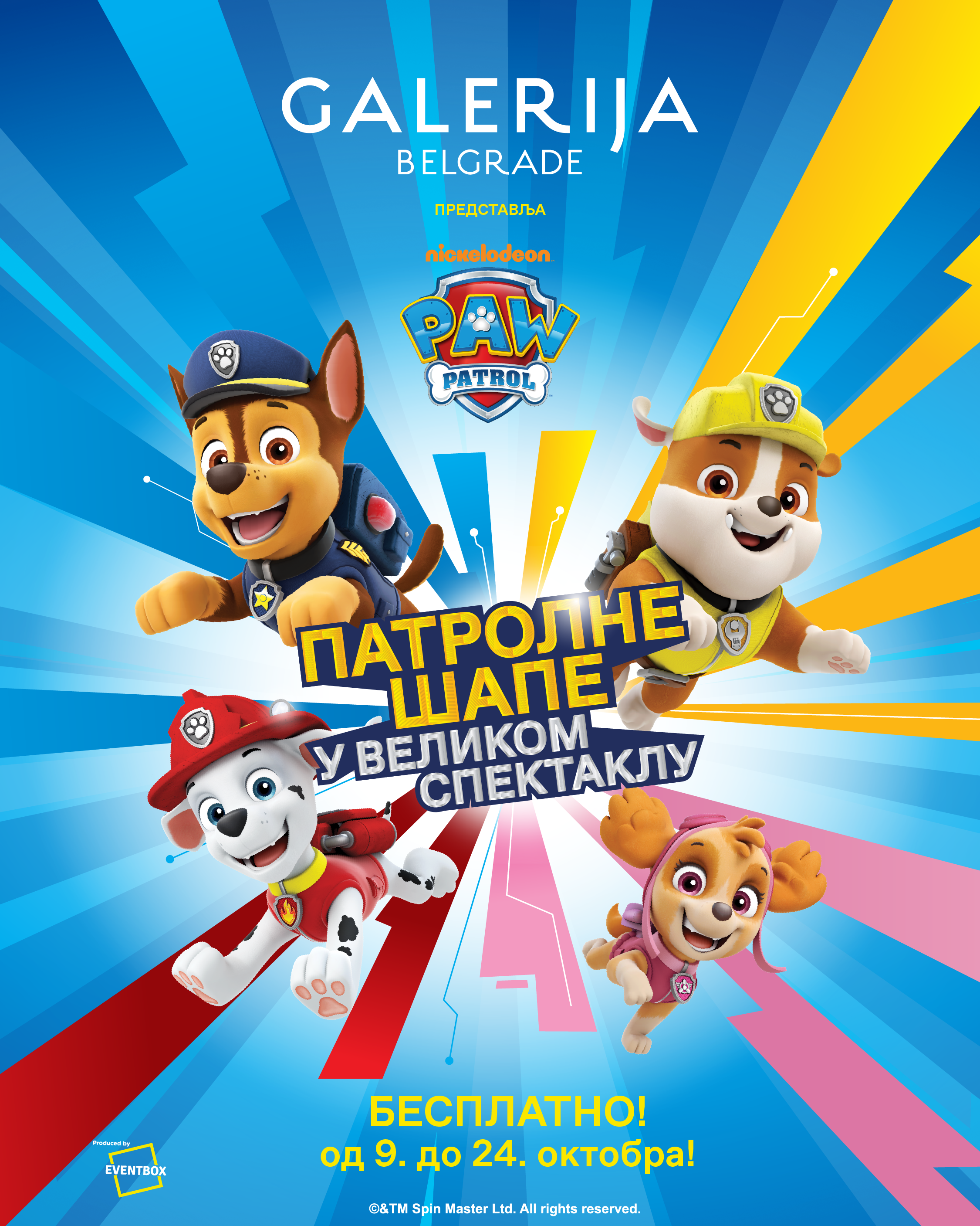Dođite i prepustite se avanturi sa omiljenom družinom svih mališana! Nikelodeonove “Patrolne šape u velikom spektaklu“ organizuje Galerija u saradnji sa Nikelodeonom, Spin Masterom i EventBoxom. Ovaj događaj je ekskluzivno dostupan u Galeriji od 9. do 24. oktobra svakog dana od 13 do 21 sati a ulaz je besplatan.