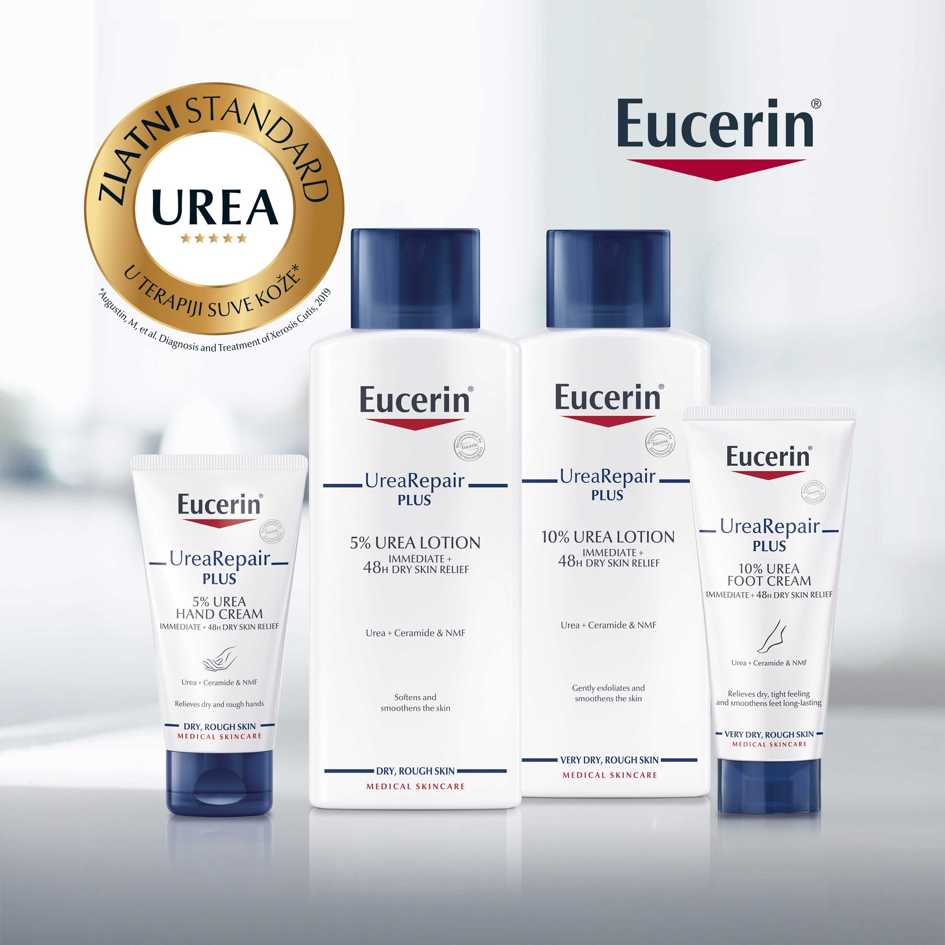 Široka ponuda Eucerin®UreaRepair PLUS linije uključuje preparate za čišćenje, losione za telo, kreme za negu lica, ruku i stopala, kao i preparate za intenzivnu negu regija intezivno suve kože.