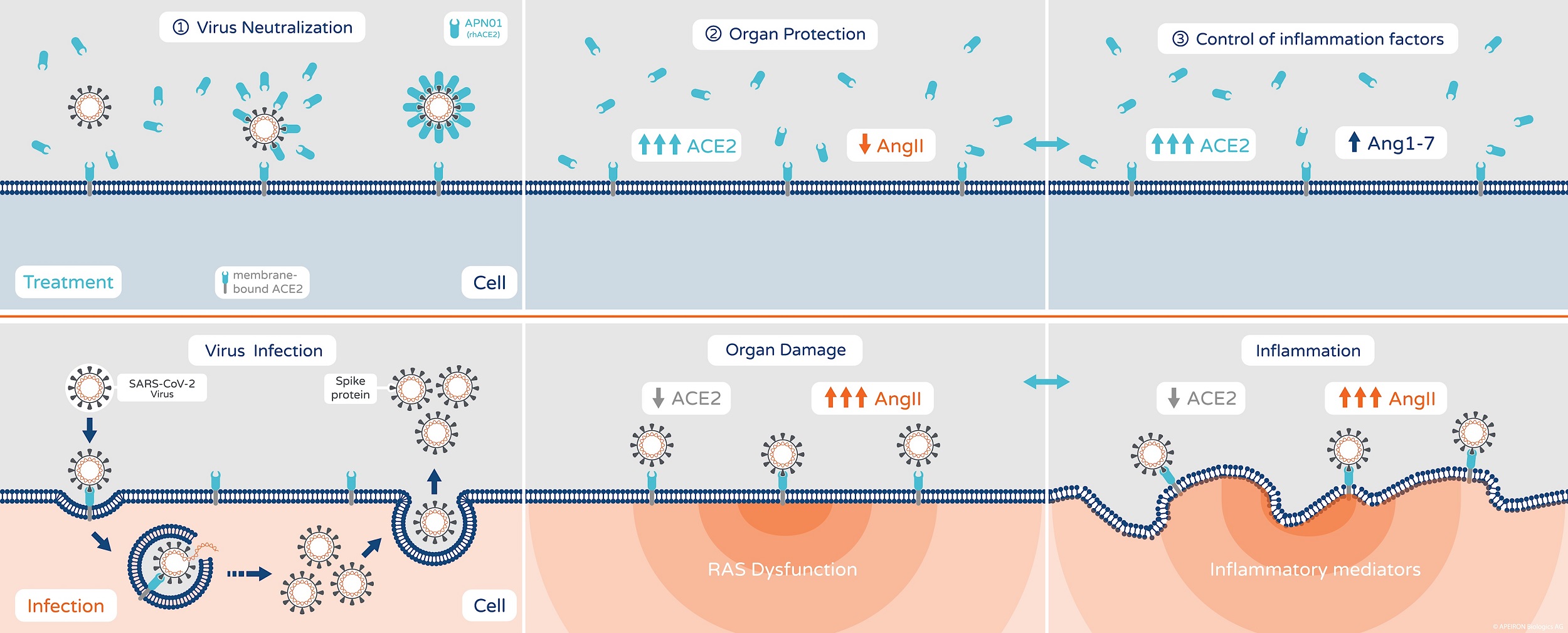 APN01 je biotehnološki proizveden angiotenzin konvertujući enzim 2 (rhACE2) koji je razvio Jozef Peninger, suosnivač kompanije Apeiron, zajedno sa svojim kolegama. Virus SARS-CoV-2 treba da se veže sa rastvorljivi enzim APN01 umesto za receptore ACE2 ljudskih ćelija koji patogenu služe kao prolaz u organizam. Cilj je da se virus blokira i spreče upalni procesi u plućima.