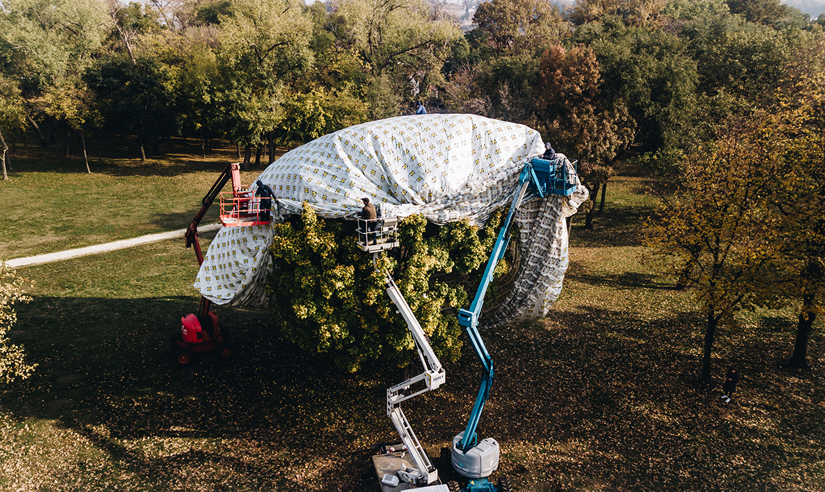 Više hiljada plastičnih kesa teških preko 400 kilograma bilo je potrebno „Pijanisti“ da se jedno drvo ispred Muzeja savremene umetnosti u potpunosti prekrije, a čak pet sati trajalo je njegovo upakivanje i raspakivanje. Za instalaciju su upotrebljene kese, preostale nakon što je Lidl Srbija iz prodaje trajno povukao ovaj artikal, s tim što su po uklanjanju instalacije poslale na reciklažu.