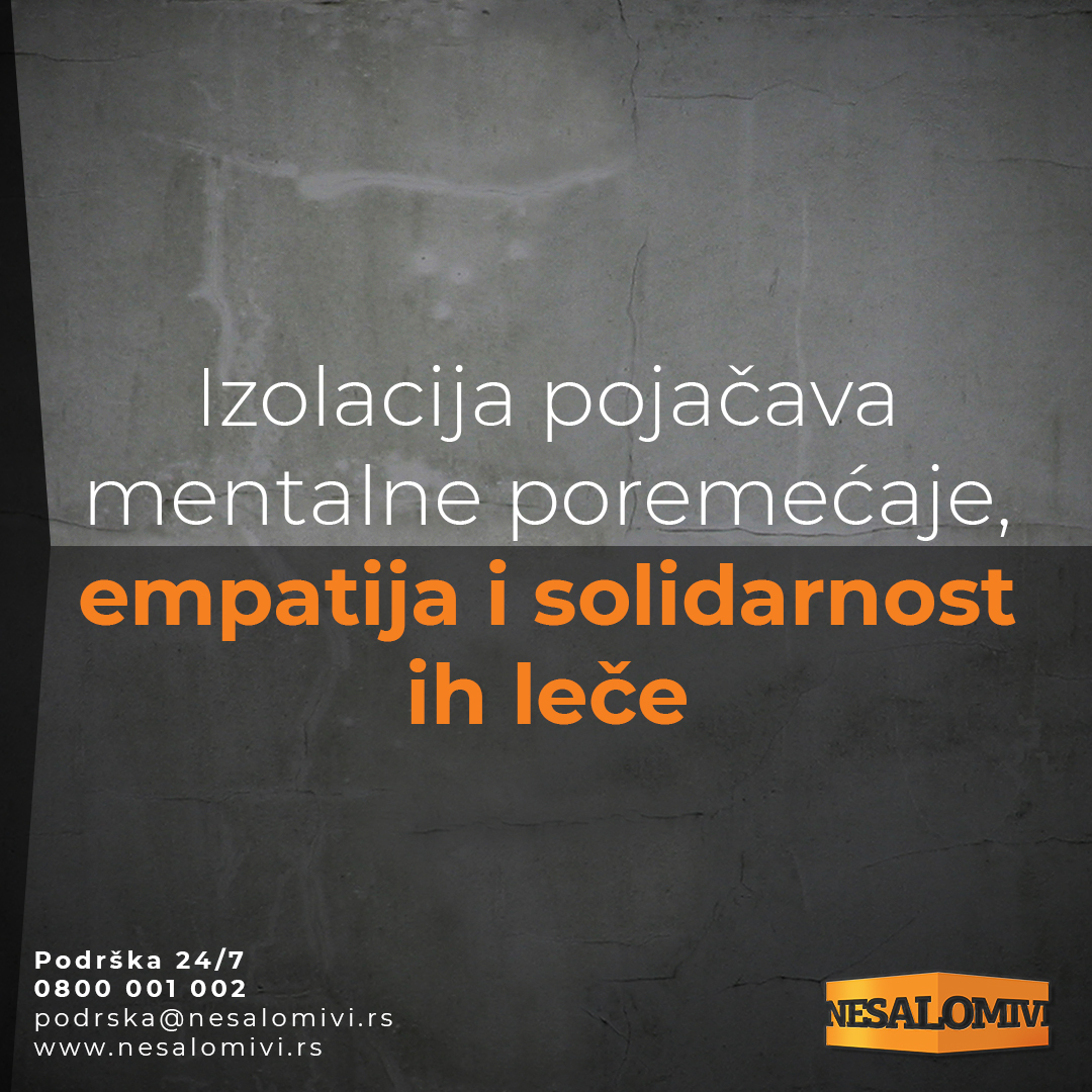 Kampanja “Nesalomivi” predstavlja mrežu pomoći i podrške stanovništvu Srbije kroz SOS liniju za borbu protiv depresije 0800 001 002, na kojoj rade stručnjaci Specijalnih bolnica za psihijatrijske bolesti u Vršcu, Gornjoj Toponici, Kovinu i Novom Kneževcu. Pozivi su besplatni, a pomoć i podrška stručnjaka dostupni 24 sata, 7 dana u nedelji. Besplatnu pomoć i podršku je moguće dobiti i putem e-mail adrese [email protected]. Svi lični podaci podnosioca molbi za pomoć ostaju strogo poverljivi i javnosti nedostupni.