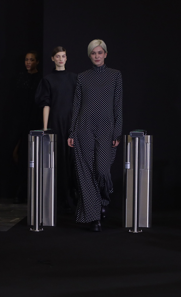 Nadaleko poznata po gracioznim kolekcijama koje odišu ženstvenošću, Dragana Ognjenović nam ove jeseni donosi kolekciju koju predstavljaju teksture delikatnih crnih perli i ornamenata na modelima, akcentovani šlicevi, koji se pojavljuju na šavovima, te siluete velikih komotnih kaputa koji reflektuju svilenkasti sjaj čvrstog satena u kontrastu sa gotovo industrijskim, metalnim rajsferšlusima kao rešenjem.