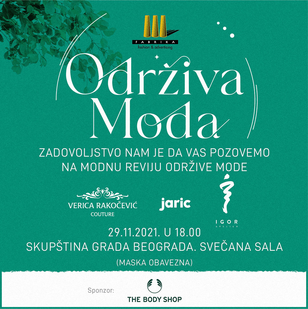 Prva revija održive mode Verice Rakočević, Tamare Jarić i Igora Todorovića, biće održana 29. novembra, u 18h, u svečanoj Sali Skupštine grada Beograda,a u organizaciji Fabrika. Ova tri vrhunska modna kreatora će prikazati mini kolekcije i po završetku revija će se obratiti publici i pojasniti njihovo viđenje održive mode.