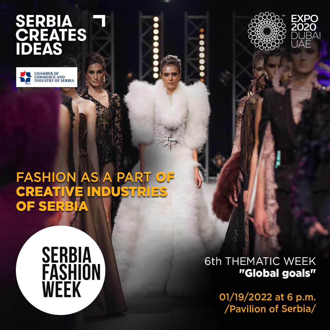 Najznačajniji internacionalni događaj koji je na globalnom nivou obeležio ovu, a izvesno je da će obeležiti i narednu godinu, EXPO Dubai 2020 približio se polovini od ukupno 6 meseci koliko će ova međunarodna izložba da traje. Na početku druge polovine, 19. januara 2022. „Serbia Fashion Week“ u saradnji sa Sektorom za preduzetništvo Privredne komore Srbije i nacionalnom platformom „Srbija Stvara“ Vlade Republike Srbije, svetu će predstaviti srpsku modu. Modni spektakl u Paviljonu Srbije počeće u 18 časova po lokalnom vremenu, kada će uslediti revije srpske modne reprezentacije koju čine priznati domaći dizajneri: Suzana Perić, Milica Tričković, Nataša Perkovski Adžić, Jelena Malešević i Nada Nikolić Krečković.