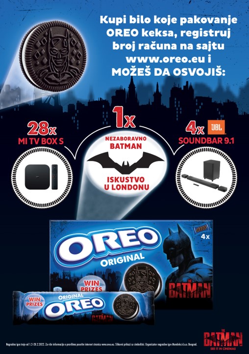 Obožavaoci od januara 2022. godine mogu da kupe pakovanje Oreo keksa inspirisano Gotam Sitijem u ograničenoj seriji. Po prvi put će izgled klasičnog OREO keksa biti izmenjen u okviru ove saradnje, sa jedinstvenim utisnutim reljefom koji prikazuje siluetu legendarnog Betmena. Kupovinom Oreo proizvoda i registrovanjem broja sa fiskalnog računa na sajtu www.oreo.eu, ljubitelji će moći da osvoje uzbudljive nagrade. Predviđene su dnevne (Xiaomi MI TV Box S) i nedeljne nagrade (JBL sound bar 9.1.), a glavna nagrada je Batman nagradno putovanje u London za dve osobe, koje uključuje Betmen avanturistički dan, vožnju u betmobilu i večeru u DC tematskom restoranu, uz 2 noćenja u 4* hotelu. Više detalja možete naći na www.oreo.eu.