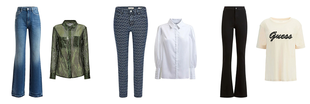 plave ženske farmerke svetlucava košulja logo farmerke bela košulja crne farmerke bež logo majica
