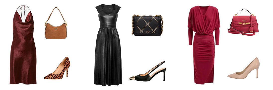 satenska mini haljina kožna  torbica braon logo salonke plisirana crna haljina torbica sa lancima kožne crne salonke ciklama midi haljina ciklama torba špicaste bež salonke