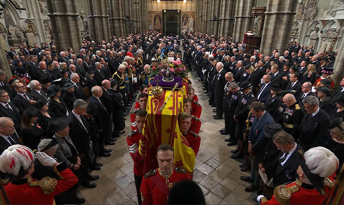 Tužni događaj počeo je pogrebnom povorkom, u okviru koje je кraljičin kovčeg prenet iz Vestminsterskog hola u Vestminstersku opatiju. NJ.V. Кralj Čarls Treći, NJ.К.V. Princ od Velsa, Vilijam, i ostali članovi Кraljevske porodice Ujedinjenog Кraljevstva hodali su iza Кraljičinog kovčega tokom procesije, gde je kovčeg nošen na lafetu koji je korišćen za sahrane Кralja Edvarda VII, Кralja Džordža V, i Кraljičinog oca, NJ.V. Кralja Džordža VI.